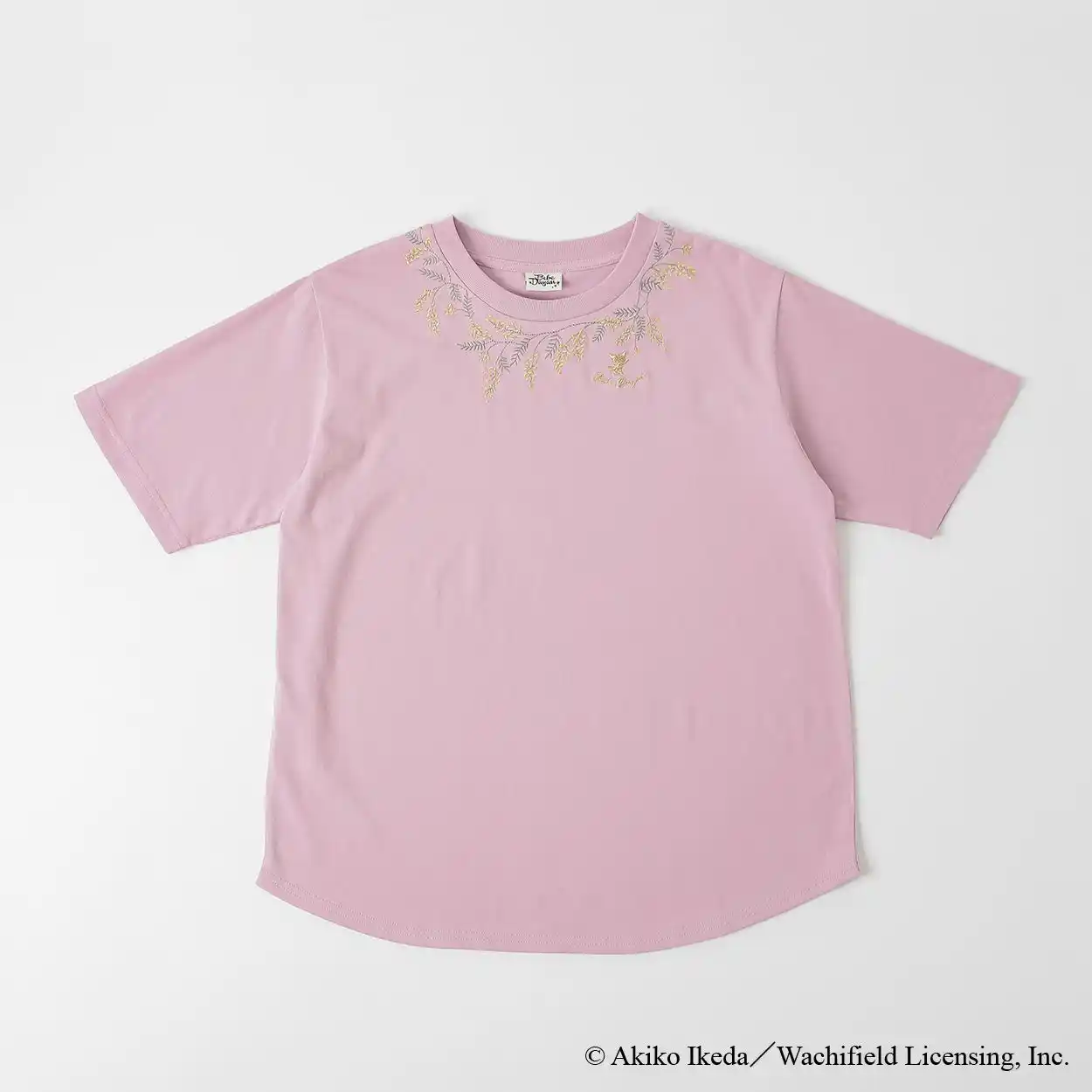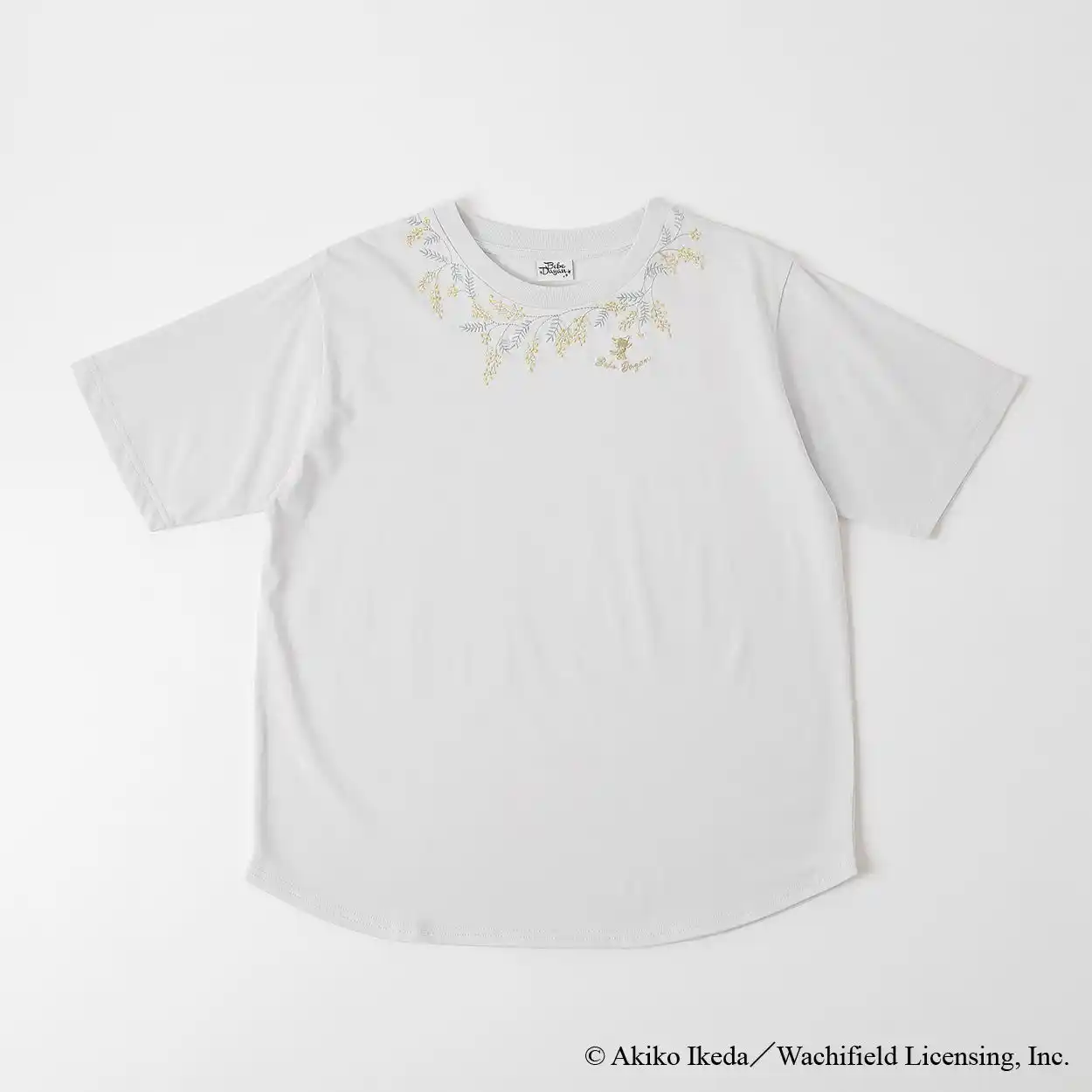 首元に草花モチーフを刺繍であしらったTシャツ。さりげない後ろ姿のべべダヤンが、わちふぃーるどの世界観をやさしく表現しています。