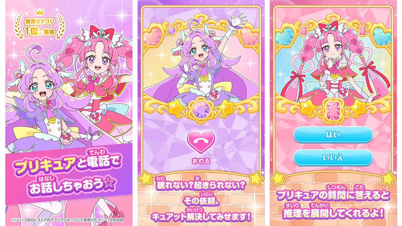 | 大好きなプリキュアから電話がかかってきて、励まされたり、ほめてもらえたり、応援してもらえたり…子どもたちが“なりたい自分”を想像し、その姿に近づけるよう応援してもらえる仮想電話アプリです。 | ||||