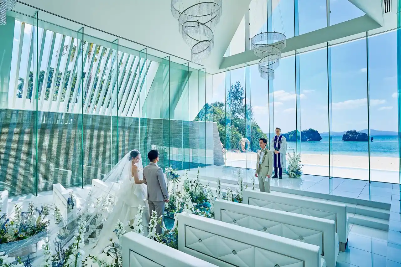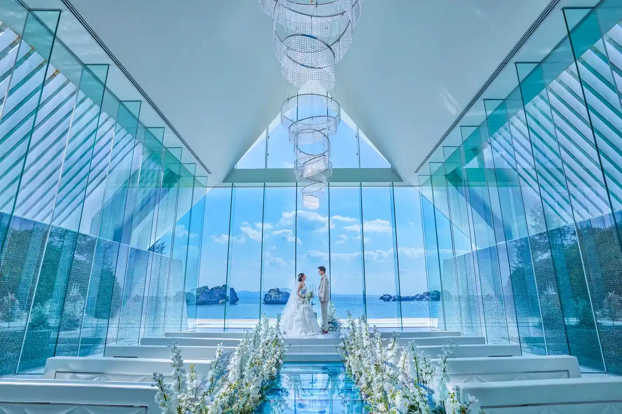ガラスのバージンロードと祭壇から広がる海が印象的なチャペル |