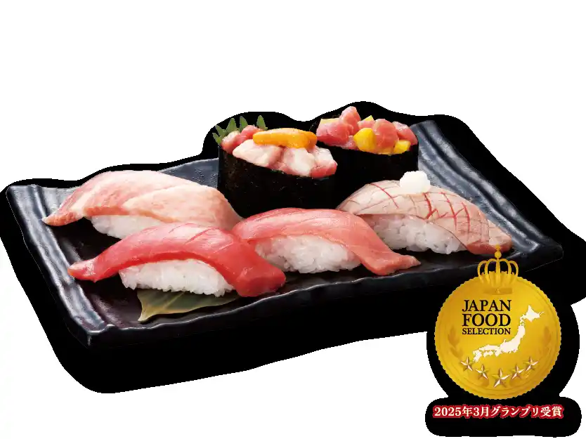 | 「本まぐろ食べ比べ六貫」は、まぐろの王様「本まぐろ」の異なる味わいを一度に楽しめる大人気商品。赤身、中とろ、大とろ、炙りとろに、うにを組み合わせた軍艦など、なんとも豪華な一皿です。さらに昨年3月には、2万3千人のフードアナリストによる日本初の食品・食材評価制度、「ジャパン・フード・セレクション」で最高ランクのグランプリを獲得しました! | ||||||||||||||