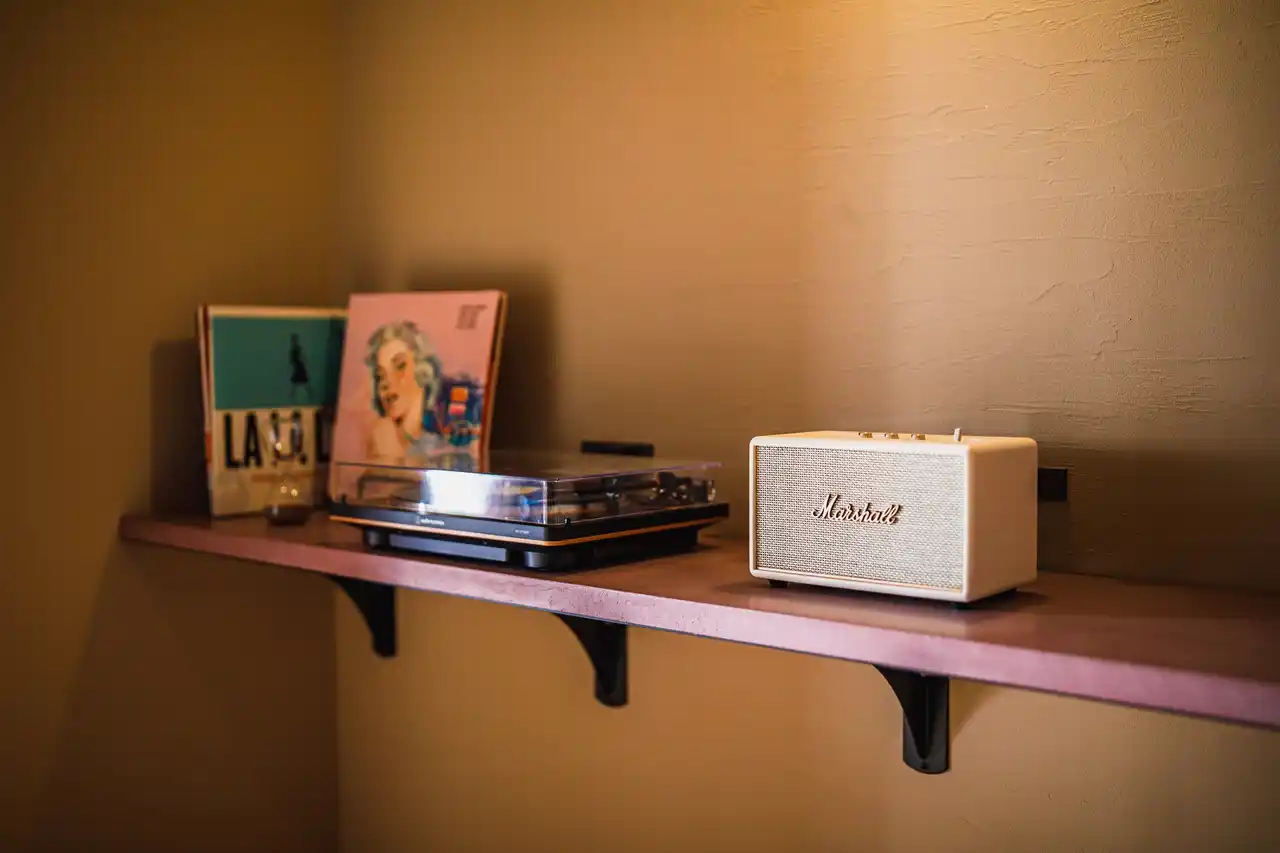 | エントランスに隣接するラウンジには、レコードプレーヤーとMarshall(マーシャル)のスピーカーを設置。スタッフが日替わりでセレクトした名作映画のサウンドトラックが流れます。映画に関わる商品やオリジナルグッズも販売予定。さらに今後は、さまざまなクリエイターの方々や企業とのコラボレーションも予定しています。 | ||||||||||||||||||||||||