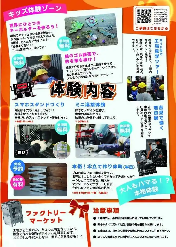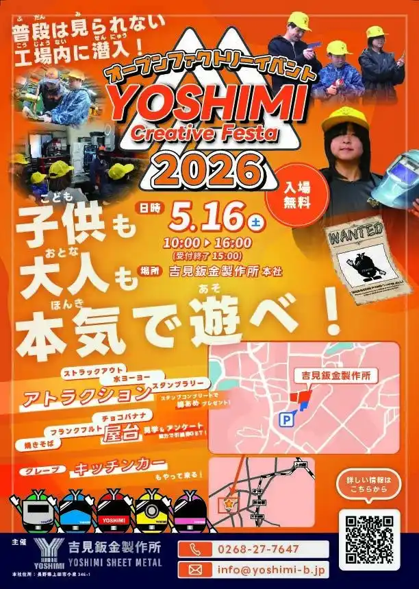 株式会社吉見鈑金製作所(本社:長野県上田市、 代表取締役:吉見 昌高)は、2026年5月16日(土)、本社工場にて体験型オープンファクトリーイベント『Yoshimi Creative Festa 2026』を開催します。 |