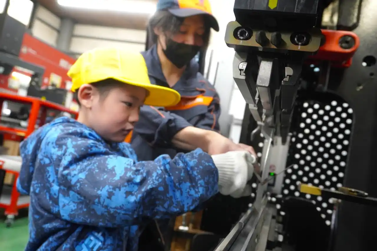 生産で実際に使われる機械を操作し、金属の板を「切る」「曲げる」「溶接する」といった工程を体験できます。 |