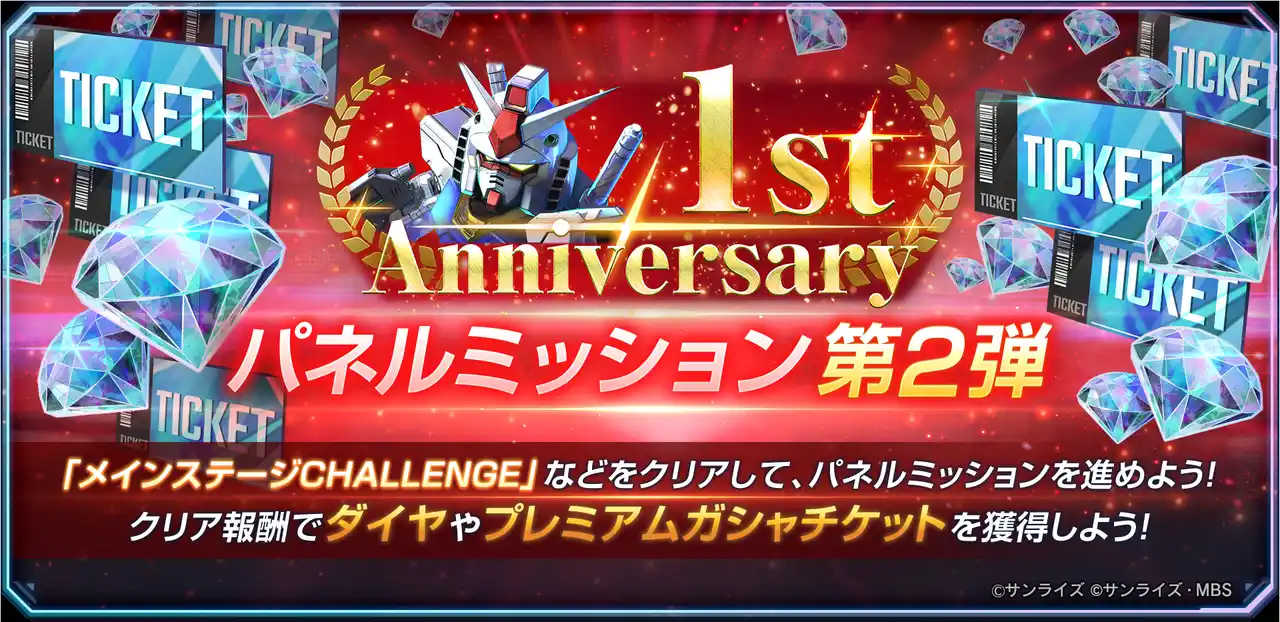 ダイヤ3000個が貰える「1stアニバーサリー パネルミッション第2弾」やUR「Ex-Sガンダム(EX)」や「ガンダム・ファラクト(Season2仕様)(EX)」などが新たに登場する「ピックアップガシャ」が開催中です。 |