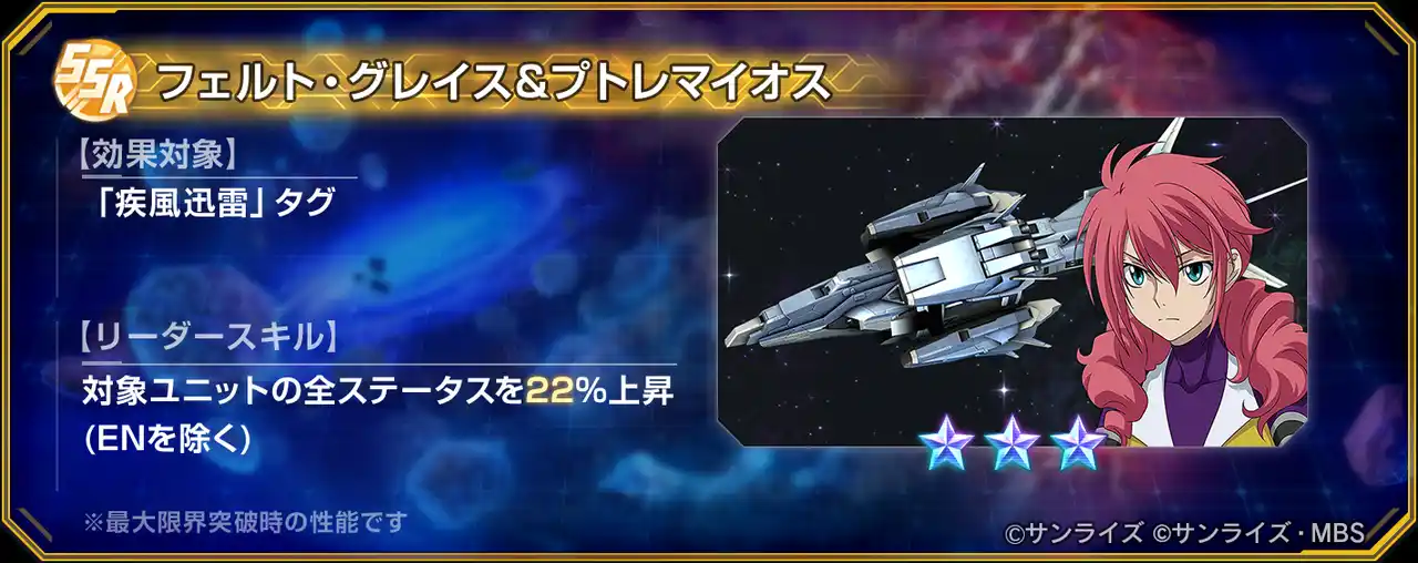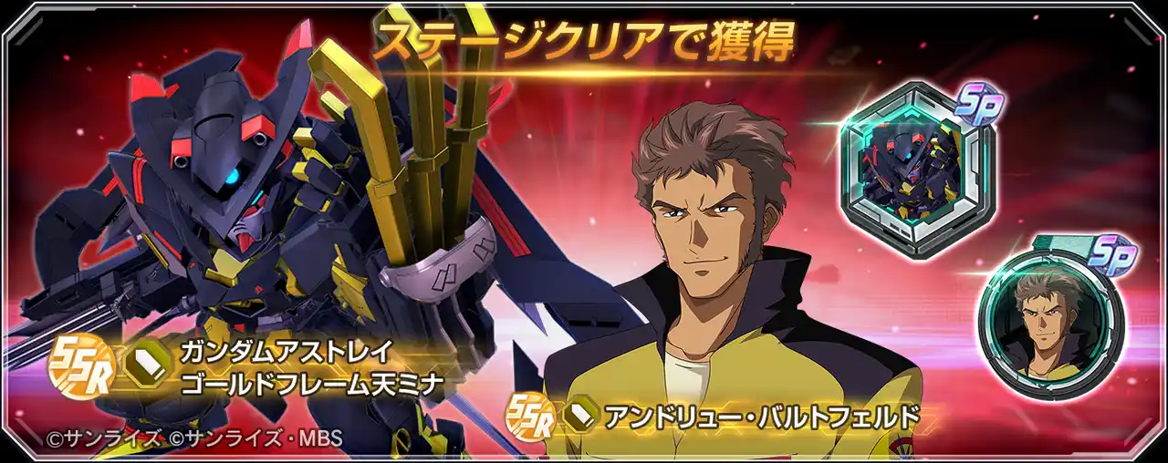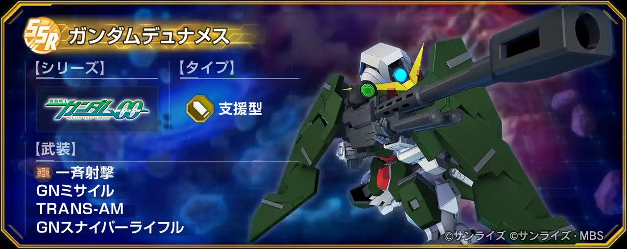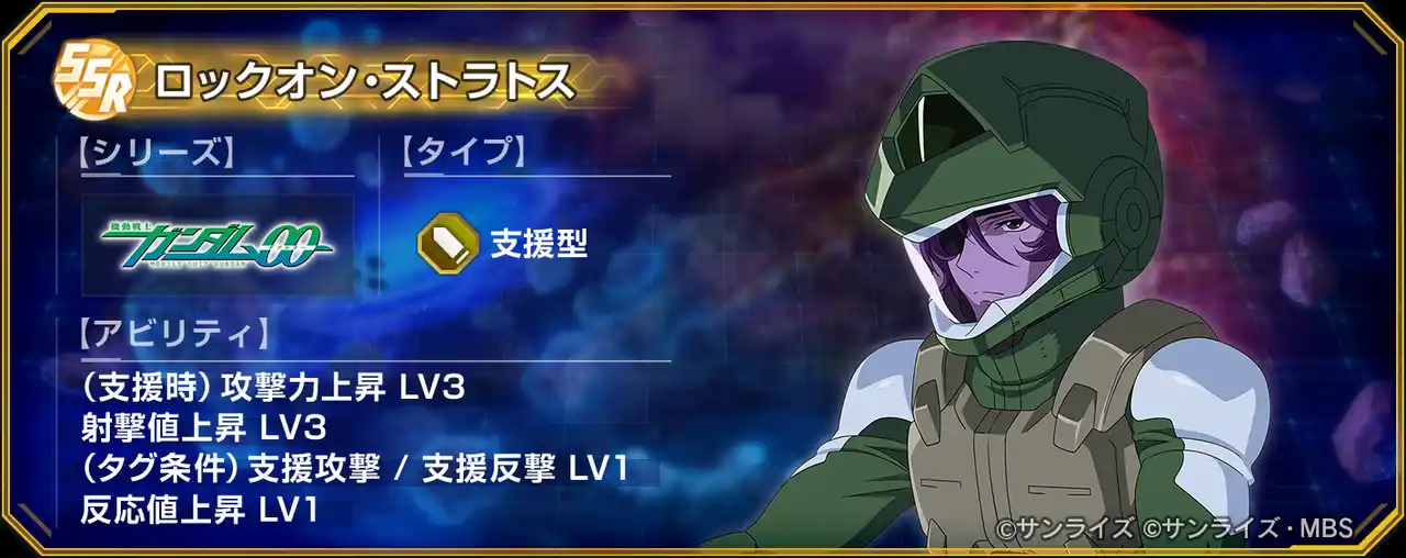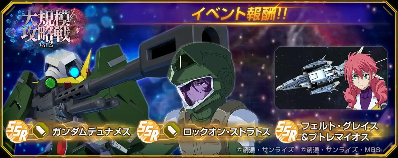 今回は「仲間」として、SSRキャラクター「ロックオン・ストラトス」、SSRユニット「ガンダムデュナメス」、SSRサポーター「フェルト・グレイス&プトレマイオス」がバトルに参加します。イベントを進めることで最大までユニットとサポーターを最大まで限界突破することができ、イベント終了後は強化した状態で獲得することが可能です。 |