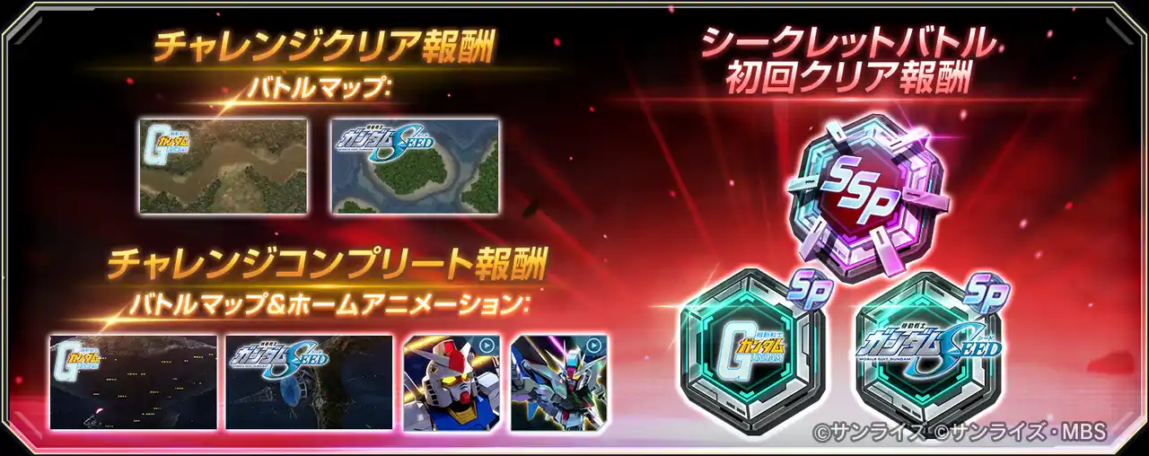 今回「メインステージCHALLENGE」が追加される作品は「機動戦士ガンダム」と「機動戦士ガンダムSEED」で、挑戦可能な作品は今後のアップデートで追加される予定です。 |