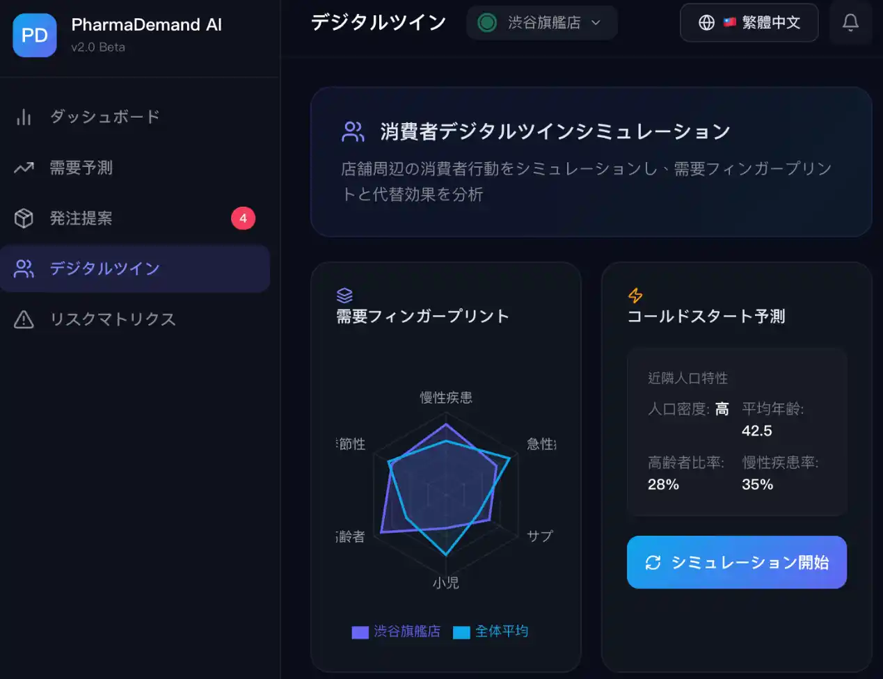 「PharmaDemand AI」は、小売薬局専用に設計されたAIネイティブ・プラットフォームです 。その核心は、「CDT (Consumer Digital Twin:消費者デジタルツイン)」モデルとPOS履歴データを融合させた独自のアルゴリズムにあります 。各店舗のSKU(最小管理単位)ごとに、将来7/30/90日間の需要変動を予測可能 。薬局経営の最優先課題である欠品リスクを解消するだけでなく、期限切れ医薬品の廃棄ロスを効果的に削減し、資産回転率を劇的に向上させます 。 |