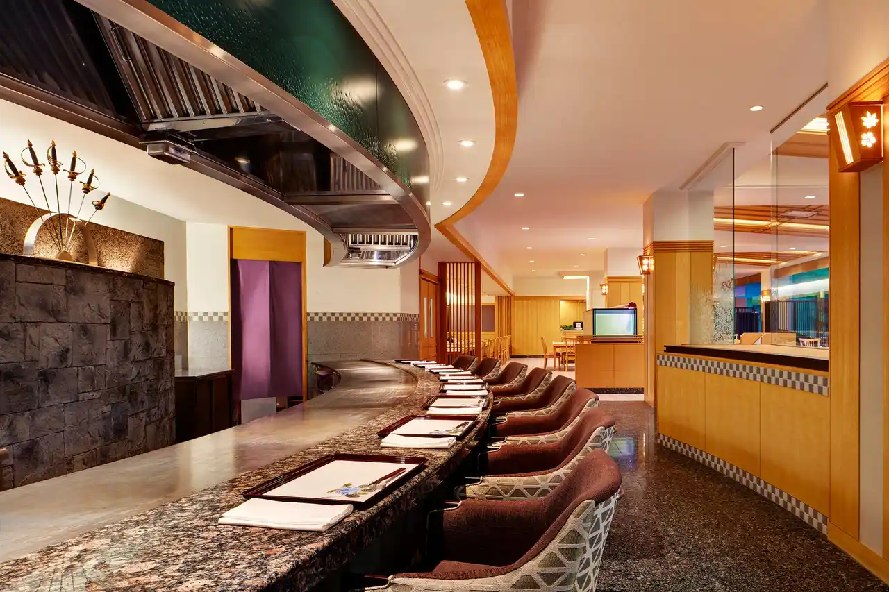 「日本料理 風花」内にある、カウンター席のみ、完全予約制の鉄板焼きダイニング。ディナーでは2種類のコースをご用意しています。 |
