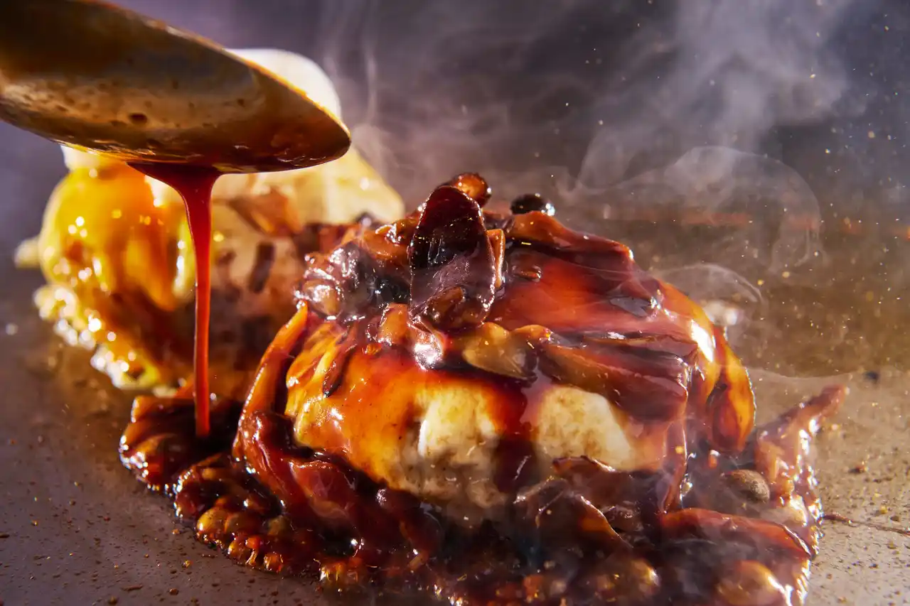 鉄板焼きカウンターにて、シェフが目の前で北海道産白老牛とルスツ高原豚を使ったハンバーグを、高温の鉄板でジューシーに焼き上げます。 |