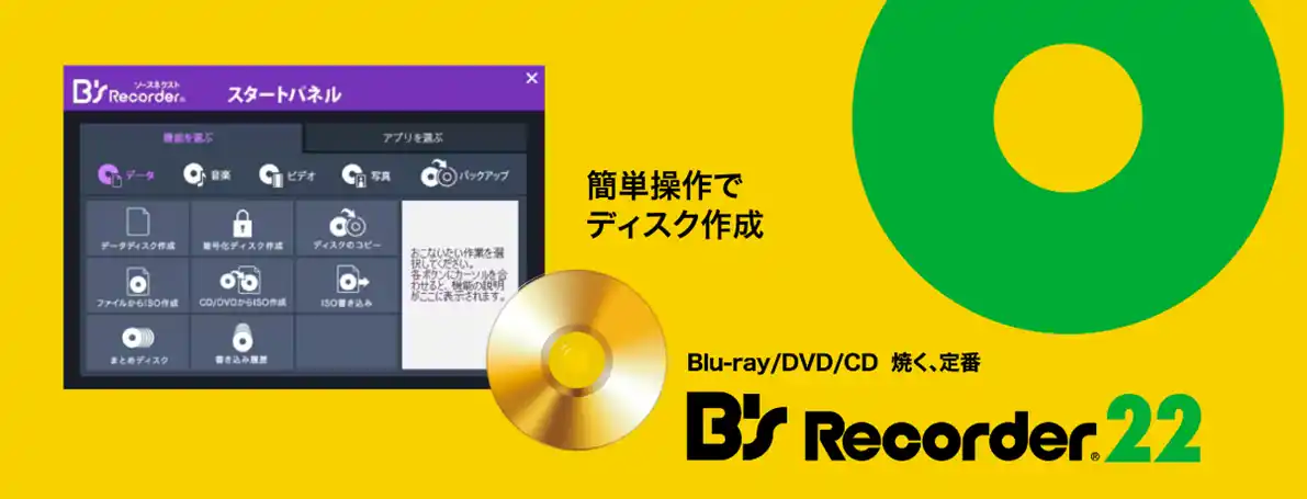 「B’s Recorder 22」は、CDやDVD、Blu-rayなどのディスクの書き込みはもちろん、音楽CD、DVDビデオやHDD/SSDのリカバーディスクの作成からファイルやディスクの暗号化、スマホ内の写真の取り込みまでディスク作成からバックアップまでできる通常版です。 |