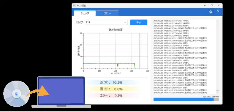 データが壊れて正常に読み込みができない場合でも、強制的にコピーしてパソコンに保存します(本機能は市販の音楽CDや映像DVD/BDなど、プロテクトのかかったディスクには使えません)。 |