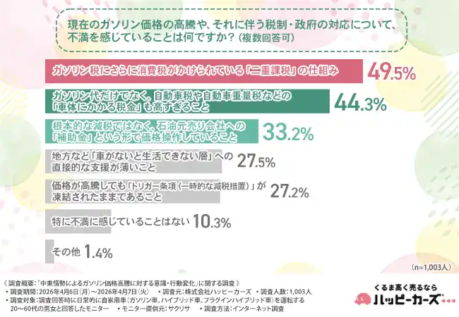 次に、「現在のガソリン価格の高騰や、それに伴う税制・政府の対応について、不満を感じていること」について尋ねたところ、『ガソリン税にさらに消費税がかけられている「二重課税」の仕組み(49.5%)』と回答した方が最も多く、『ガソリン代だけでなく、自動車税や自動車重量税などの「車体にかかる税金」も高すぎること(44.3%)』『根本的な減税ではなく、石油元売り会社への「補助金」という形で価格操作していること(33.2%)』と続きました。 |