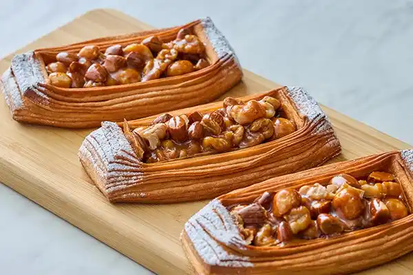 何層にも折り重ねた繊細な層が魅力のデニッシュ生地にチョコレートクリームを絞り、キャラメリゼしたマカダミアナッツ、アーモンド、くるみの3種類のナッツを乗せて焼き上げました。噛むたびに弾けるナッツのカリッとした食感と香ばしさ、キャラメリゼのほろ苦い甘みがデニッシュ 生地と見事に調和した、多層的な食感が楽しいデニッシュです。 |