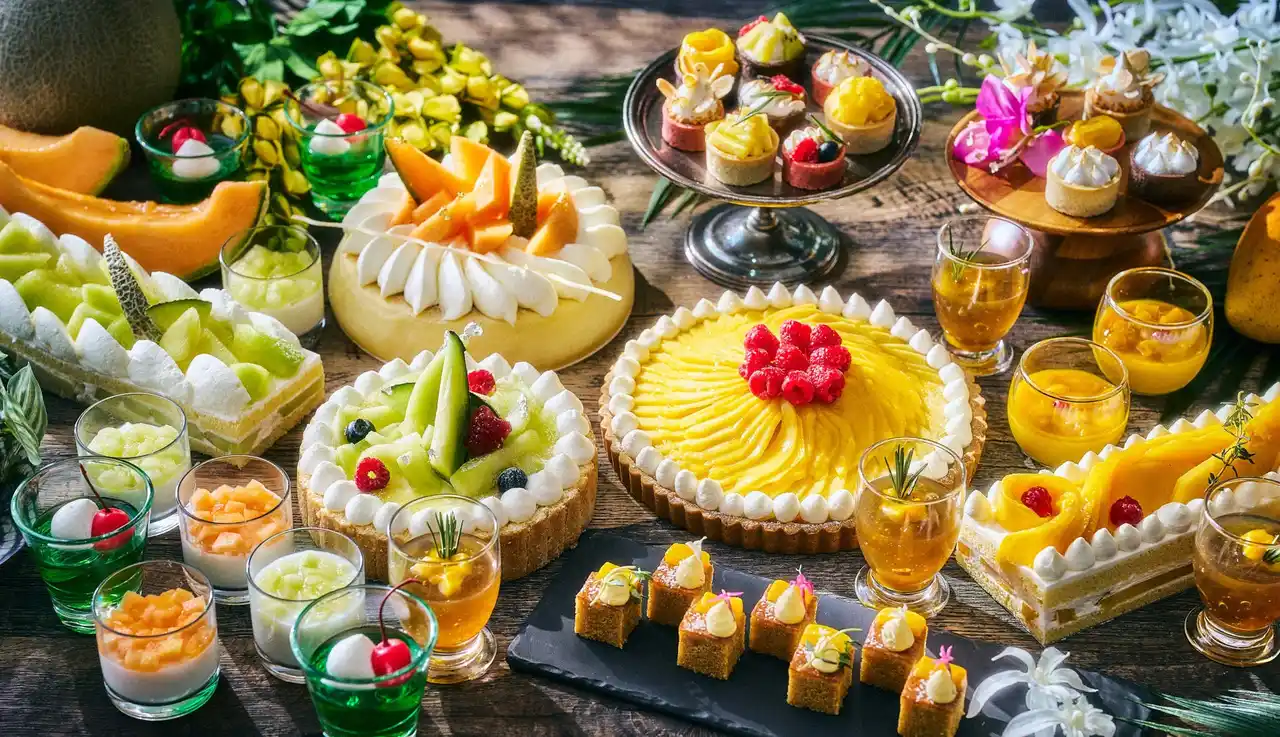 デザートエリアには、旬のマンゴーとメロンを贅沢に使用したスイーツをご用意。「マンゴーショートケーキ」や「メロンショートケーキ」をはじめ、サクッとしたタルト生地にとろける果肉をあしらった「マンゴータルト」、さっぱりとした味わいの「杏仁メロン」や「クリームソーダ風ゼリー」など、初夏らしい彩りのデザートが揃います。 |