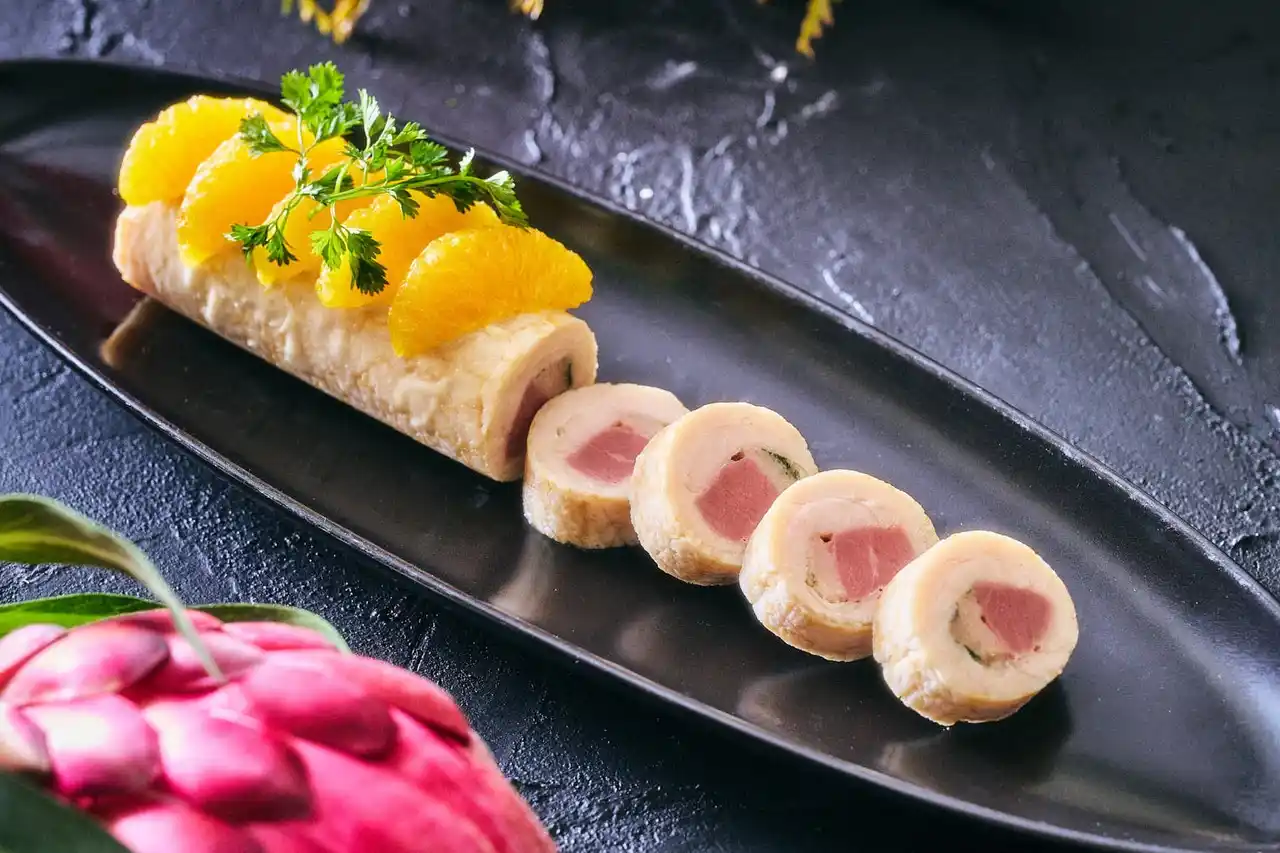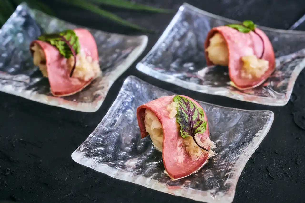 低温調理でやわらかく仕上げたスモークタンでマッシュポテトを包み、葱しょうがを添えて |