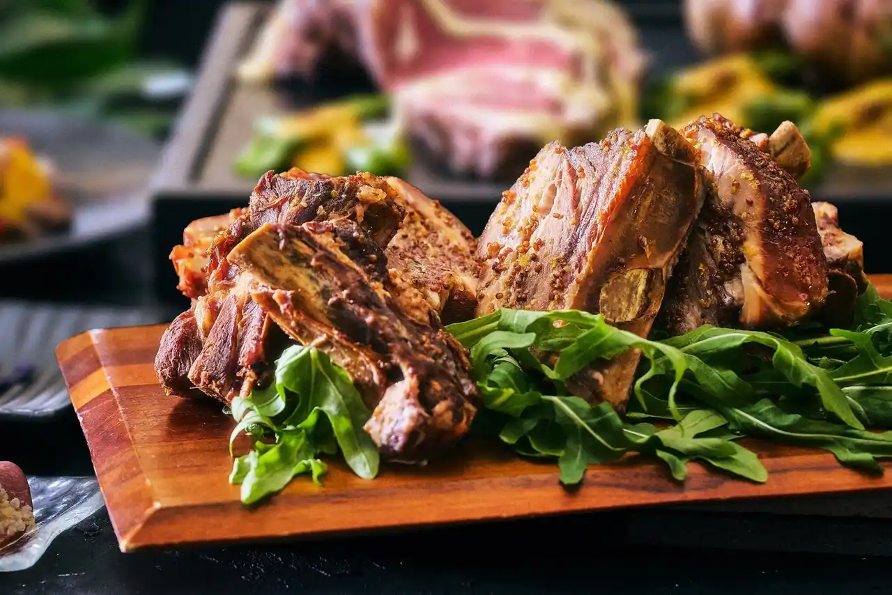 ビュッフェ台には、ハチミツのコクと粒マスタードの酸味を効かせたポークスペアリブや、スパイスに漬け込んだ鶏肉をジューシーに焼き上げたケバブチキン、やわらかな牛タンを葱しょうがでさっぱりと味わえるメニューなど、バラエティ豊かな肉料理が並びます。 |