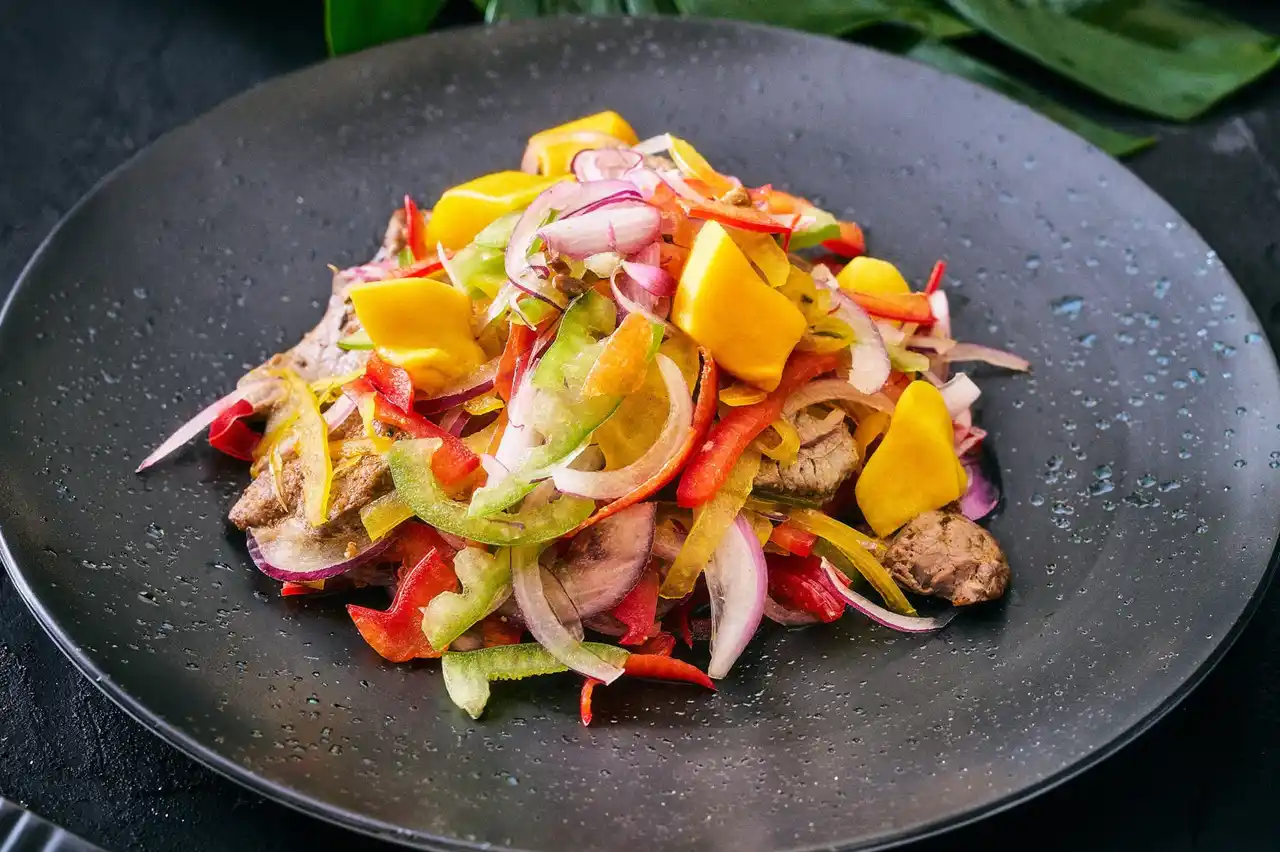 マンゴーの甘みと爽やかな風味が、牛肉のコクを引き立てる冷製前菜 |