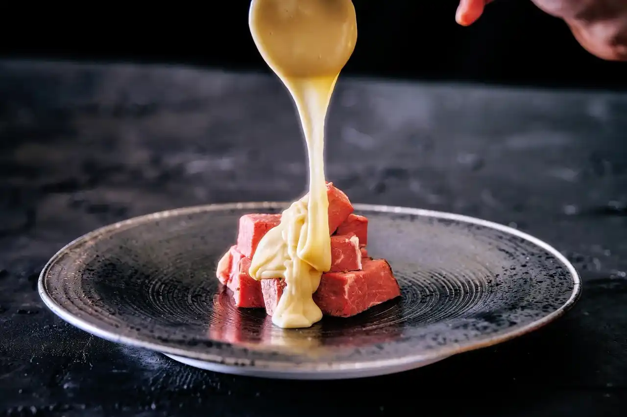 低温調理でしっとりジューシーに仕上げたローストビーフを藁で燻し、ガーリックとチーズソースのコクを効かせたソースで味わう一品 |