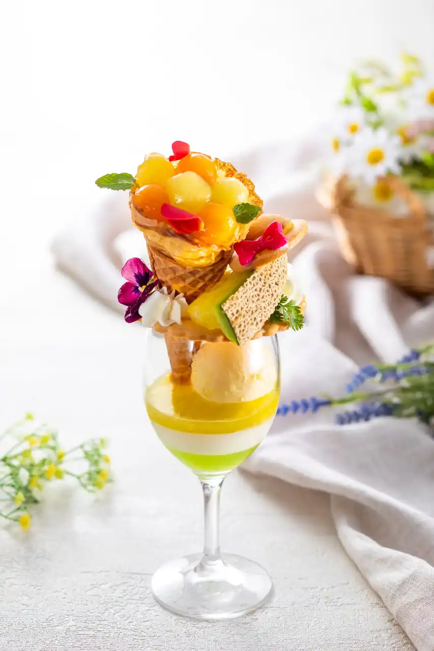 | パフェのトップを飾るのは、華やかな“ブーケ”仕立てのメロンクレープです。ふんわりとしたクレープ生地で、丸くくりぬいた瑞々しいメロンボールを包み込みました。香ばしくサクサクとしたコーンの食感のコントラストに心が弾みます。さらにピンクのリボンをあしらった麦わら帽子のクッキーを添え、ノスタルジックで心ときめくデザインに仕上げています。 | |||