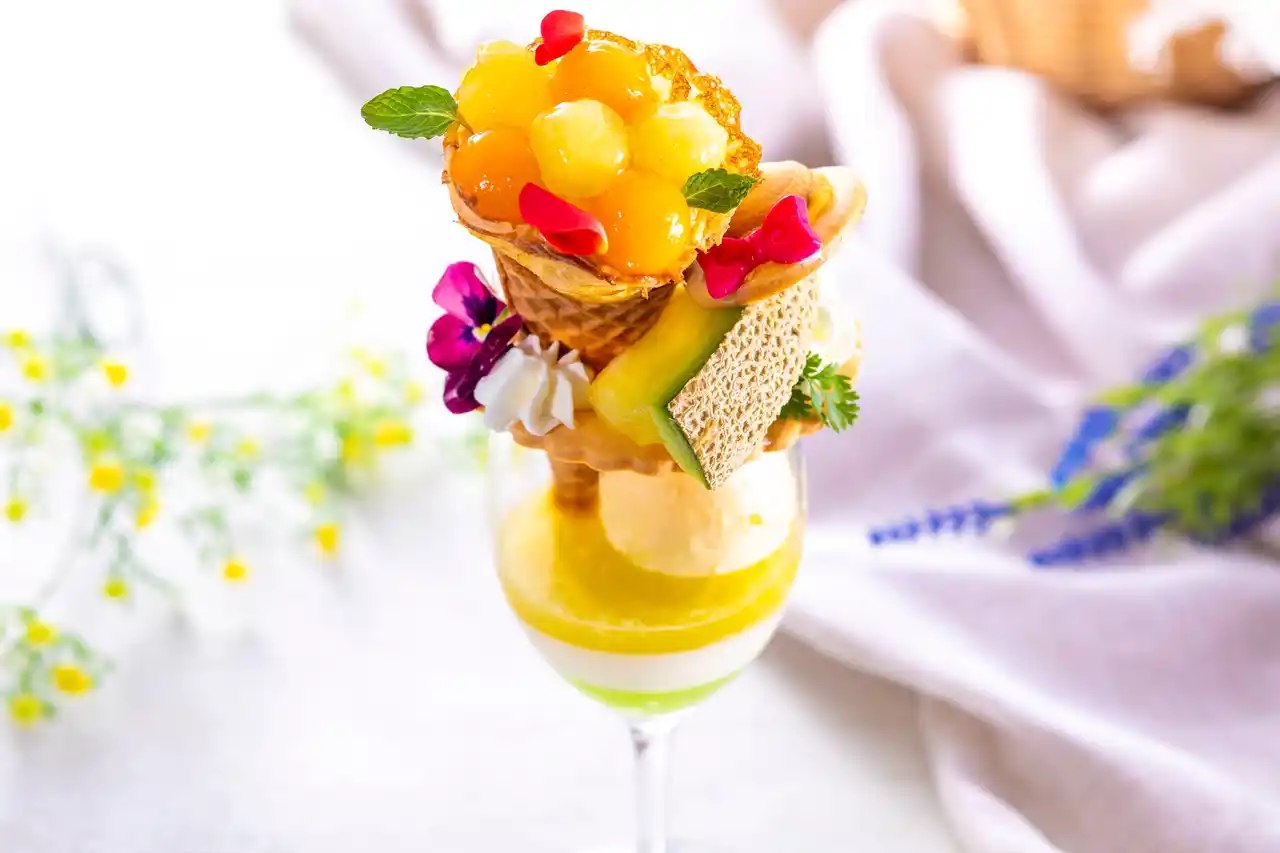 | 「メロンクレープのブーケパフェ」は、初夏にぴったりの爽やかな味わいでメロンを贅沢に愉しめる季節限定のパフェです。 | |||