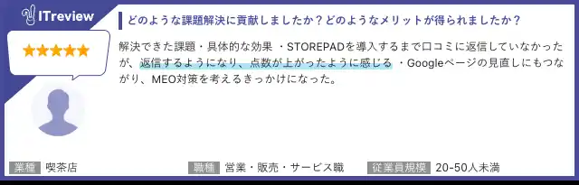 この度、ITレビュープラットフォーム「ITreview」において、STOREPADをご利用中の飲食店およびマーケティング事業者様より多くの高評価をいただきました。 貴重なご意見をお寄せいただいた皆様に、厚く御礼申し上げます。 平素よりのご愛顧に感謝するとともに、今後もより良いサービスの提供に尽力してまいります。 |