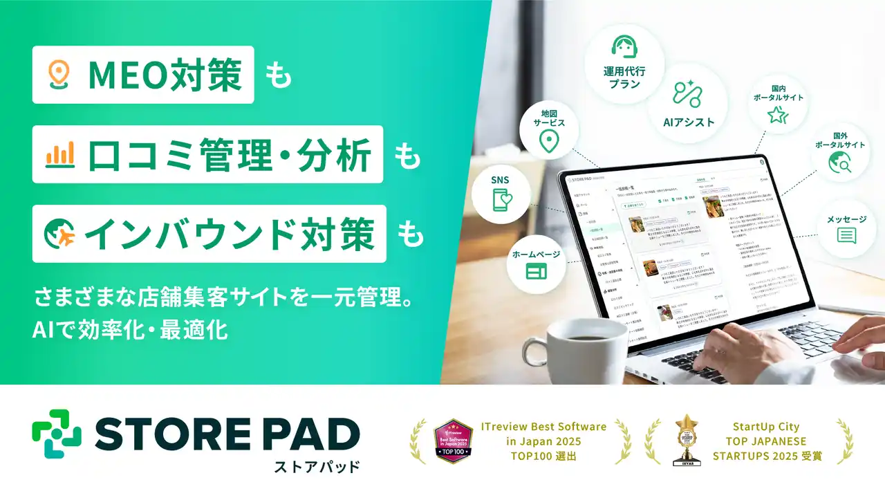 STOREPADは、国内外のさまざまな店舗集客メディアと連携する、店舗情報発信・分析プラットフォームです。地図アプリ・ポータルサイト・インバウンド向けメディア・SNS・HPなど様々な媒体への一括情報発信や口コミ分析で工数削減と集客向上、効果的なMEOを実現。店舗運営を成功に導きます。 |