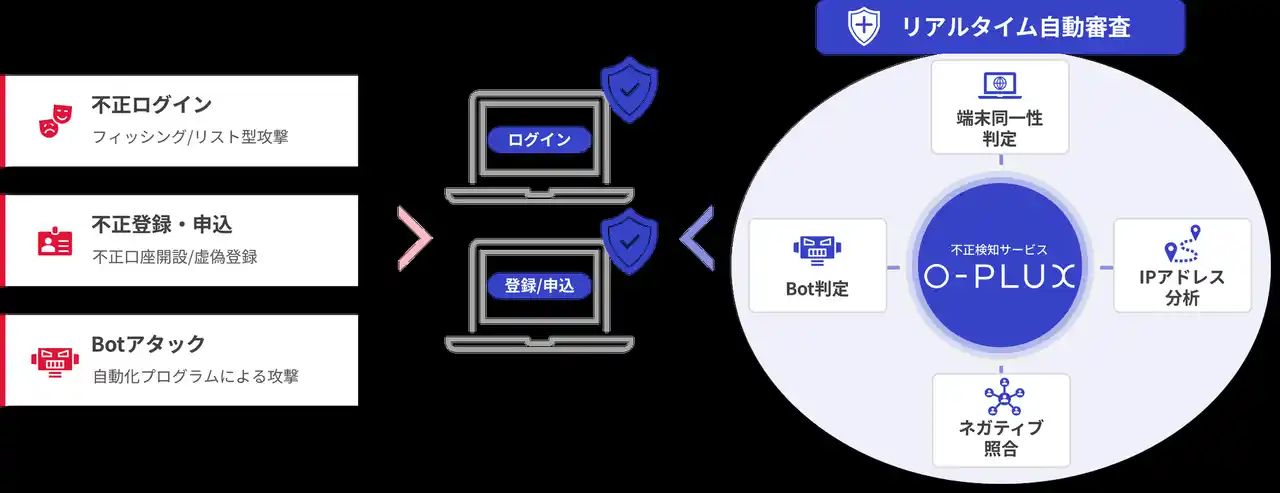 Caccoが提供する不正検知サービス「O-PLUX」は、「ログイン画面」「登録/申込画面」への「不正ログイン」「不正会員登録/口座開設/申込」「Botアタック」を検知/モニタリングするためのクラウドサービスです。 |