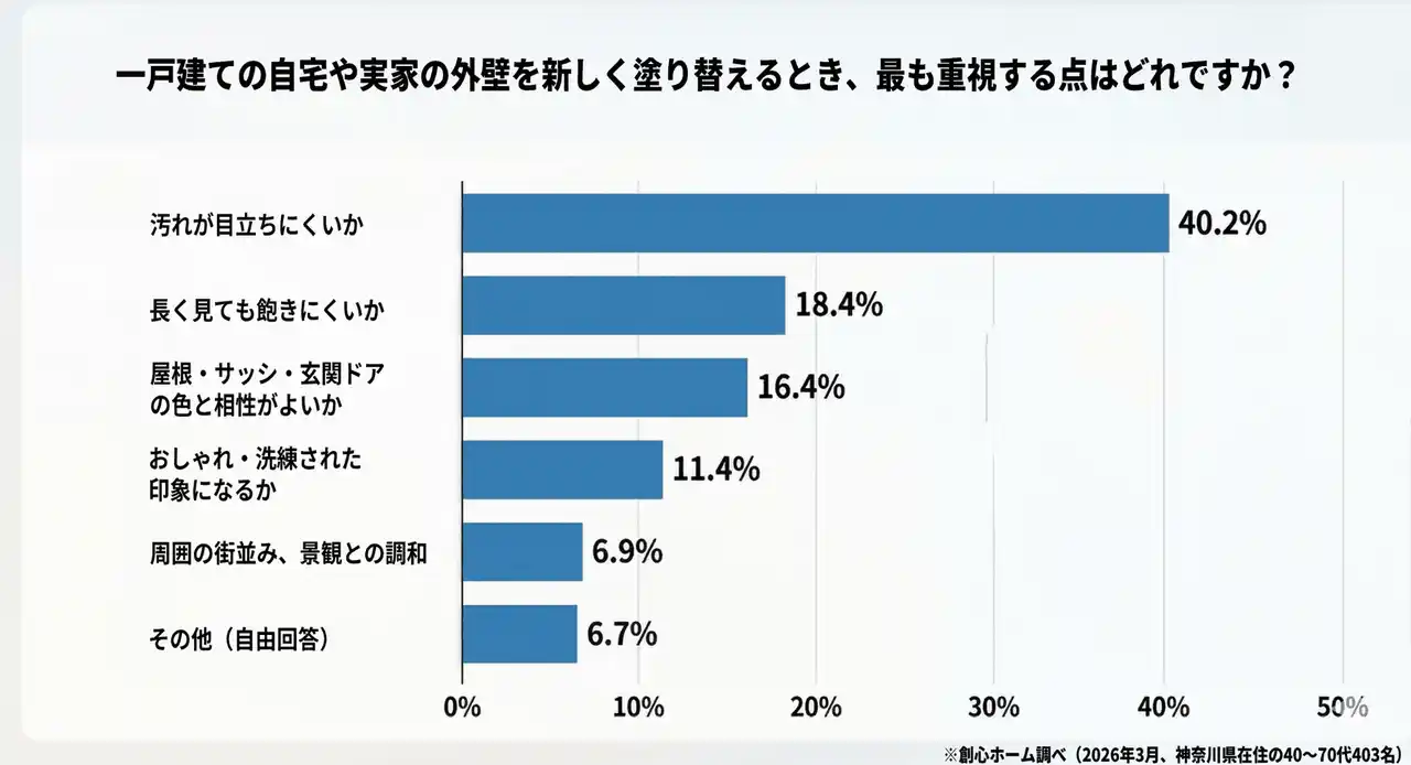 神奈川県民の一戸建て外壁塗装では、見た目の華やかさより、長く住むうえでの実用性が優先されていることが分かります。 |
