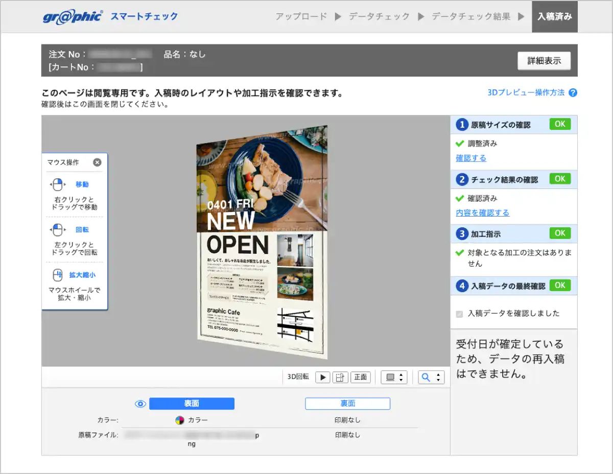 入稿時にご確認いただいたチェック結果や加工指示の内容を、入稿完了後から商品発送日の7日後までマイページから閲覧いただけます。 |
