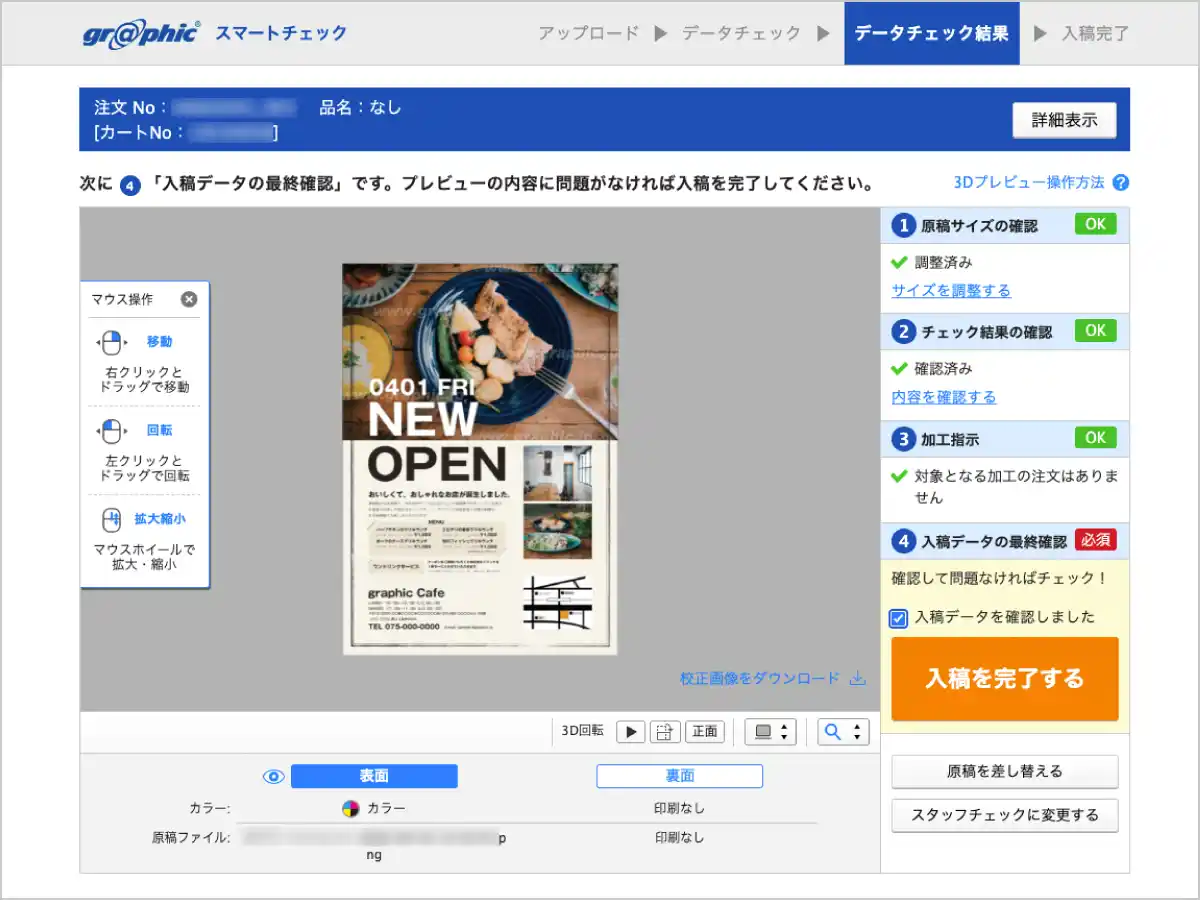 株式会社グラフィックネットプリント(本社:京都市伏見区、代表取締役社長:西野能央、以下「当社」)が運営する、ネット印刷事業「印刷の通販(R) グラフィック」にて、入稿データを自動でチェックし、仕上がりイメージを確認できる「スマートチェック」に新機能を追加。入稿データのプレビュー画面を、商品出荷後でも閲覧いただけるようになりました。 |