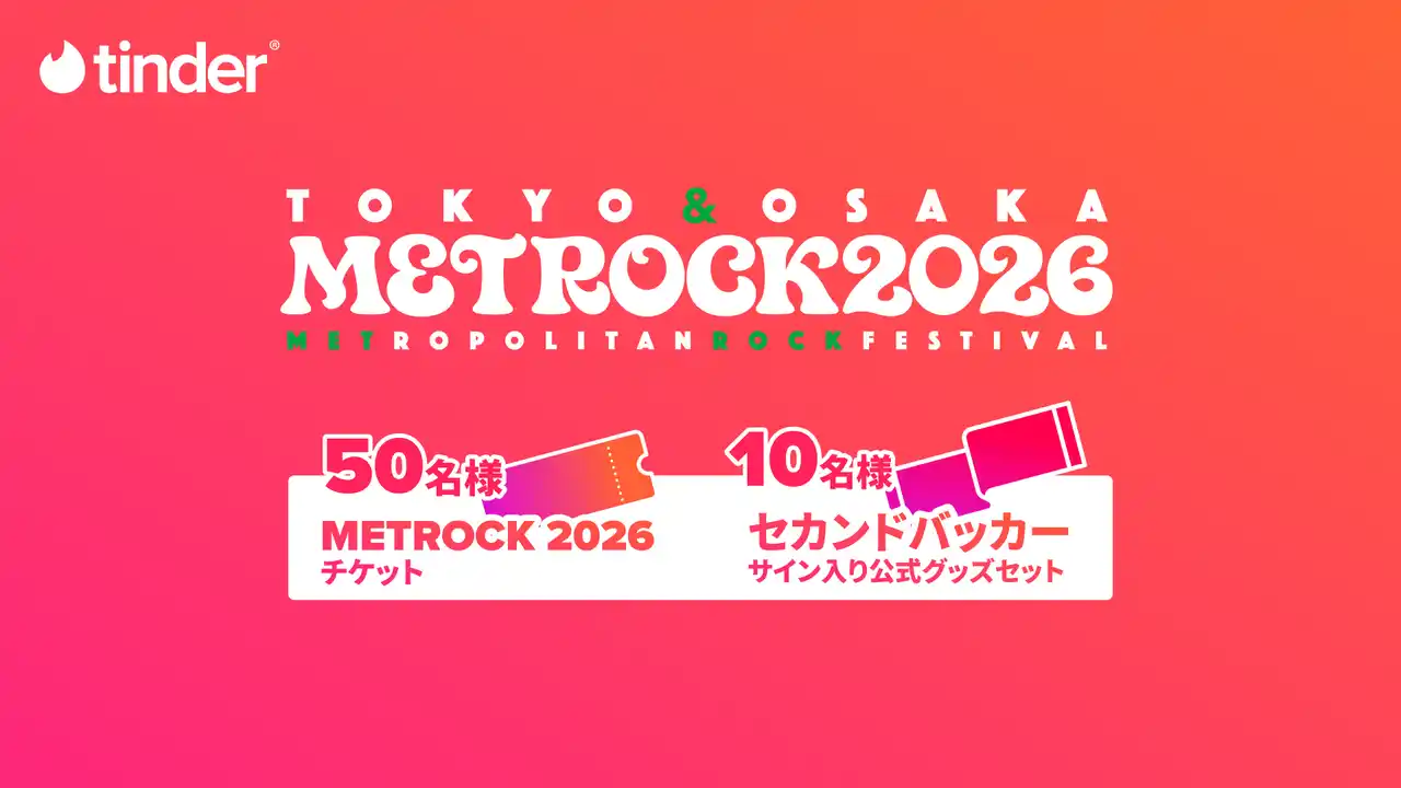 また、『METROCK 2026』とのコラボレーション企画として、Tinderユーザーを対象に、『METROCK 2026』のチケットや、セカンドバッカーのサイン入りグッズが抽選で当たるプレゼントキャンペーンを実施します。「ミュージックモード」を通じて音楽の趣味を共有しながら、リアルな音楽体験へとつながる機会を提供します。 |