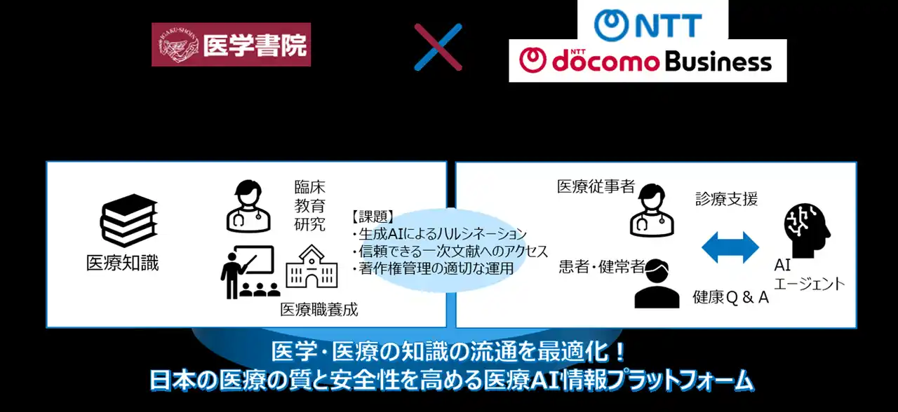 株式会社医学書院(本社:東京都文京区、代表取締役社長:金原 俊、以下「医学書院」)とNTT株式会社(本社:東京都千代田区、代表取締役社長:島田 明、以下「NTT」)およびNTTドコモビジネス株式会社(旧 NTTコミュニケーションズ株式会社、本社:東京都千代田区、代表取締役社長:小島 克重、以下「NTTドコモビジネス」)は、医療AI情報プラットフォームの開発を通じて、医療の発展に寄与することをめざし、協業基本契約を2026年4月16日に締結しました。 |