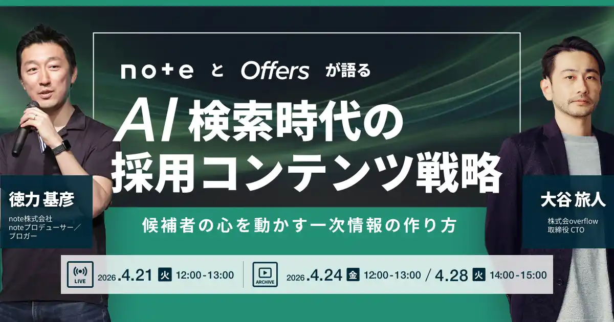 【直近開催予定】AI検索時代の採用コンテンツ戦略 ~noteとOffersが語る候補者の心を動かす一次情報の作り方~|4/21(火)・4/24(金)・4/28(火)開催