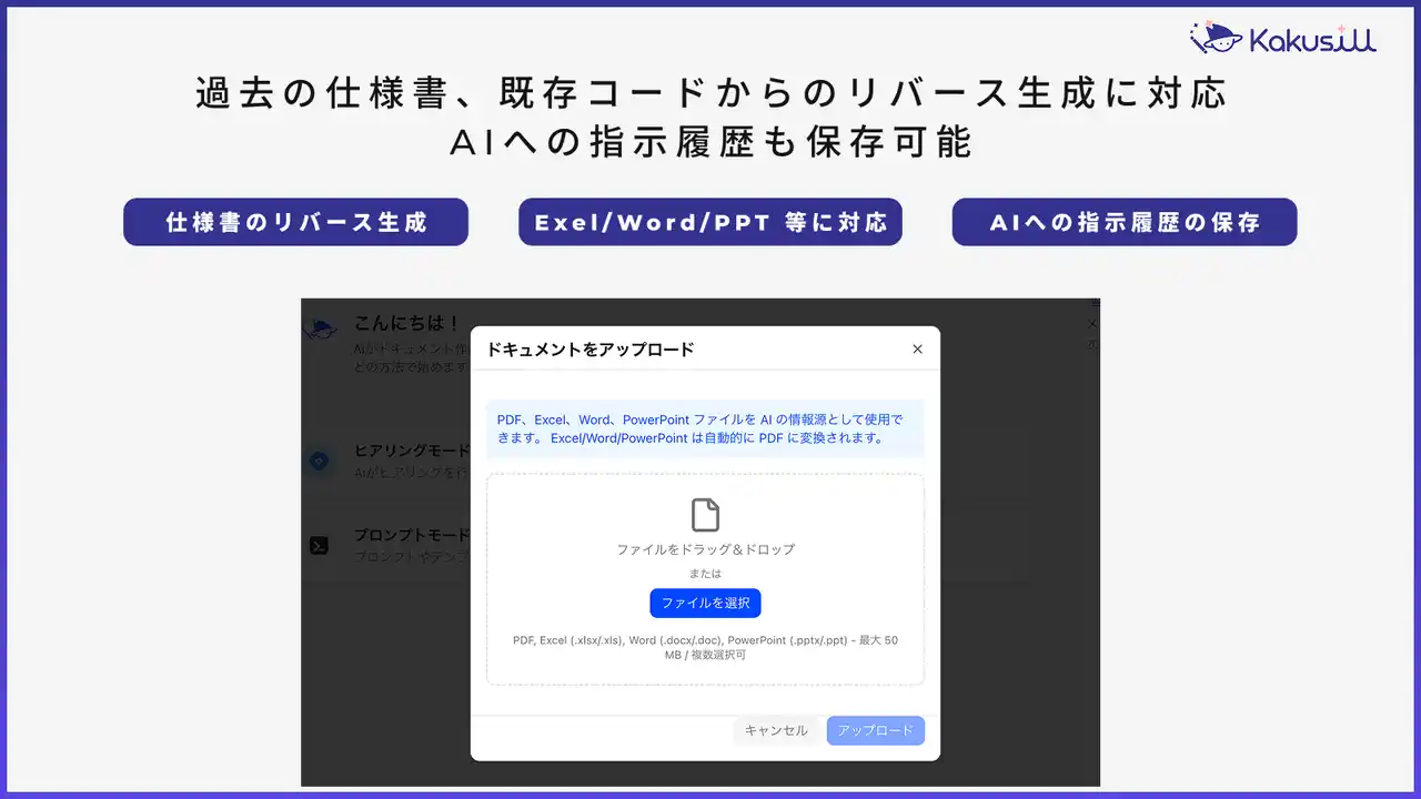 過去のExcel・Word仕様書のインポートや、既存コードからの仕様書リバース生成に対応。新規導入でも、これまでの資産をそのまま活用できます。AIへの指示履歴も保存され、プロジェクトの文脈が蓄積されていきます。 |