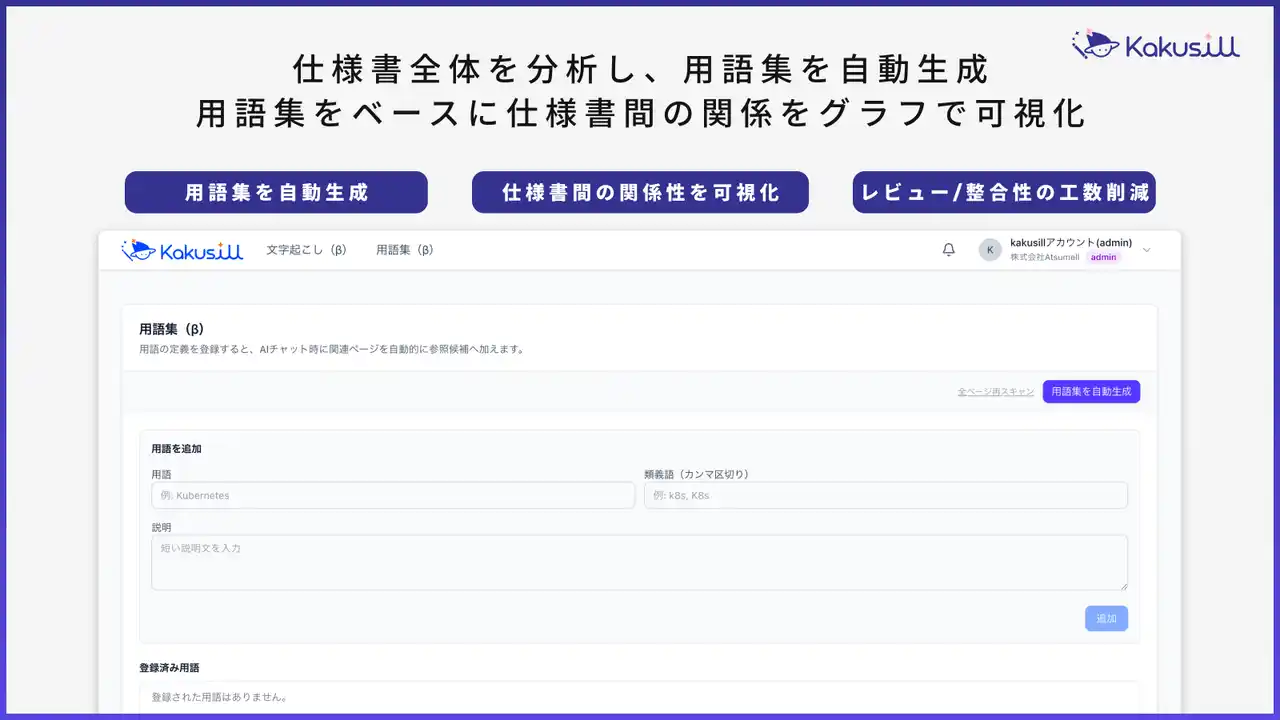 Kakusillは、プロジェクト内の仕様書全体を解析し、登場する概念・用語の用語集を自動生成します。この用語集をベースに、仕様書間の関係性をグラフとして可視化。「どの仕様書がどの仕様書と関連しているか」「同じ用語が別の文脈で使われていないか」を一目で把握できるようにします。これにより、これまで熟練PMが膨大な時間をかけて行っていたレビューと整合性確認の負荷を大幅に削減します。 |