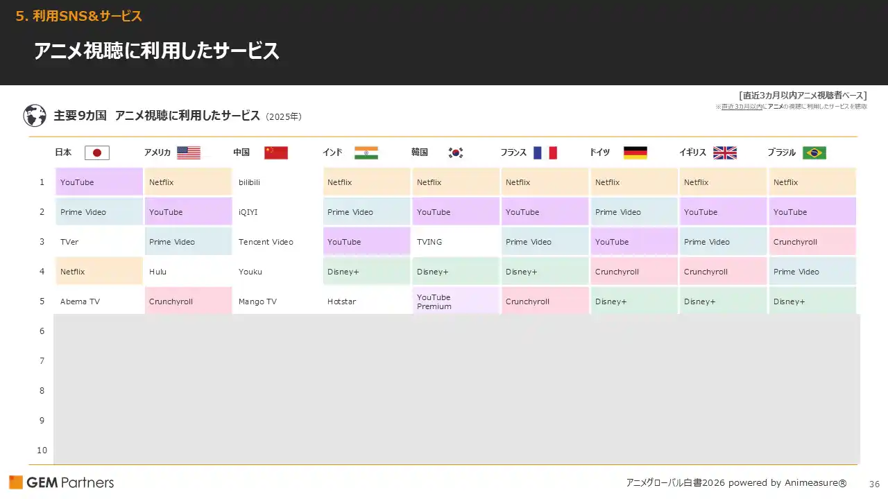 ・アニメ視聴に使用したサービスは、「Netflix」が日本と中国以外でトップ。「Prime Video」「YouTube」も多くの国で上位にランクイン。 |