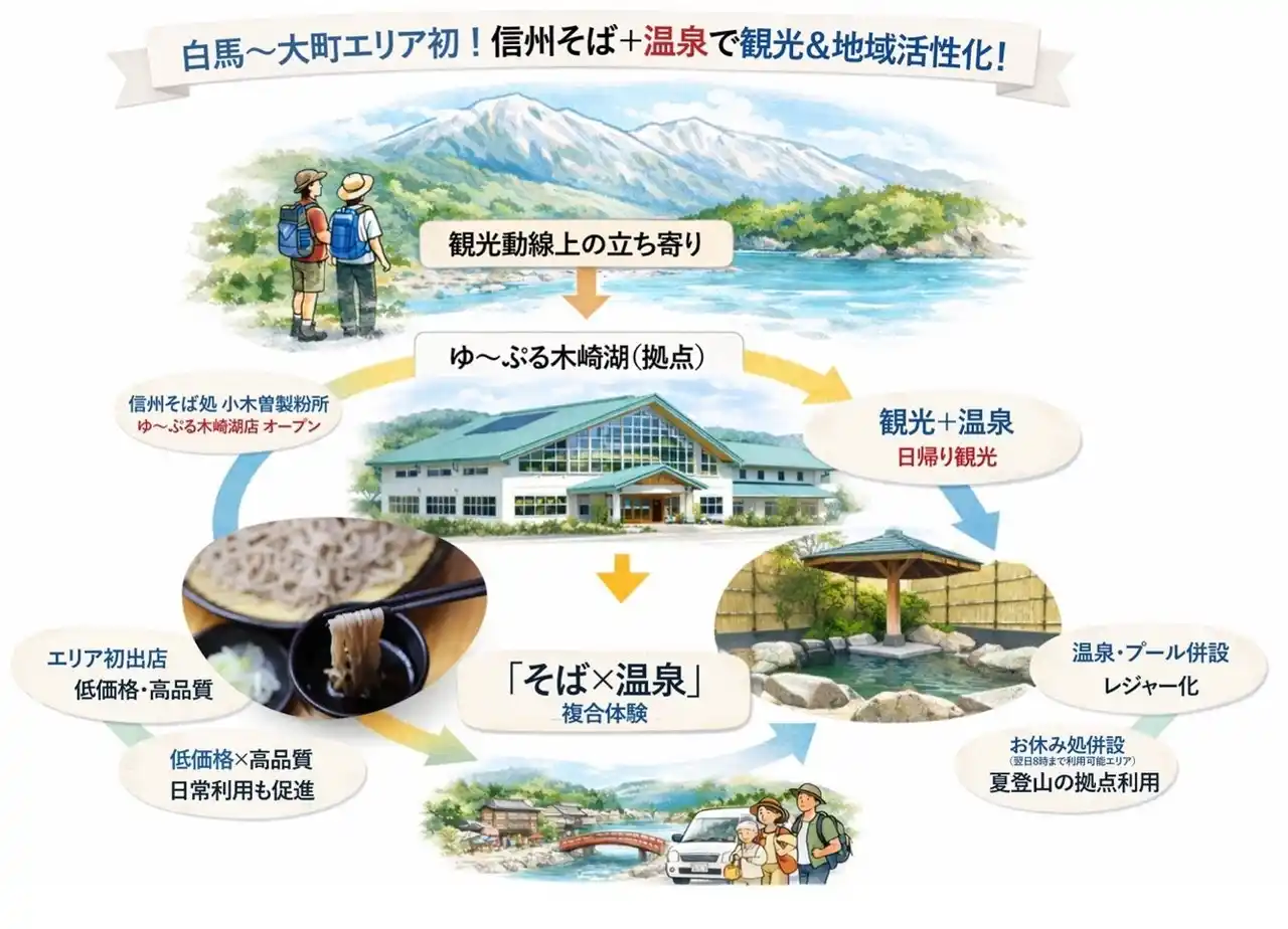 長野県大町市の温浴・観光施設「ゆ~ぷる木崎湖」を運営する木崎湖温泉開発株式会社は、2026年4月24日、「信州そば 小木曽製粉所 ゆ~ぷる木崎湖店」を新規オープンいたします。当施設は木崎湖畔に位置し、これまで日帰り温泉施設として地域住民や観光客に親しまれてきました。今回の出店により、温泉に加えて“気軽に楽しめる本格信州そば”を提供し、食事と癒しを一体で楽しめる観光拠点としての魅力向上を図ります。 |