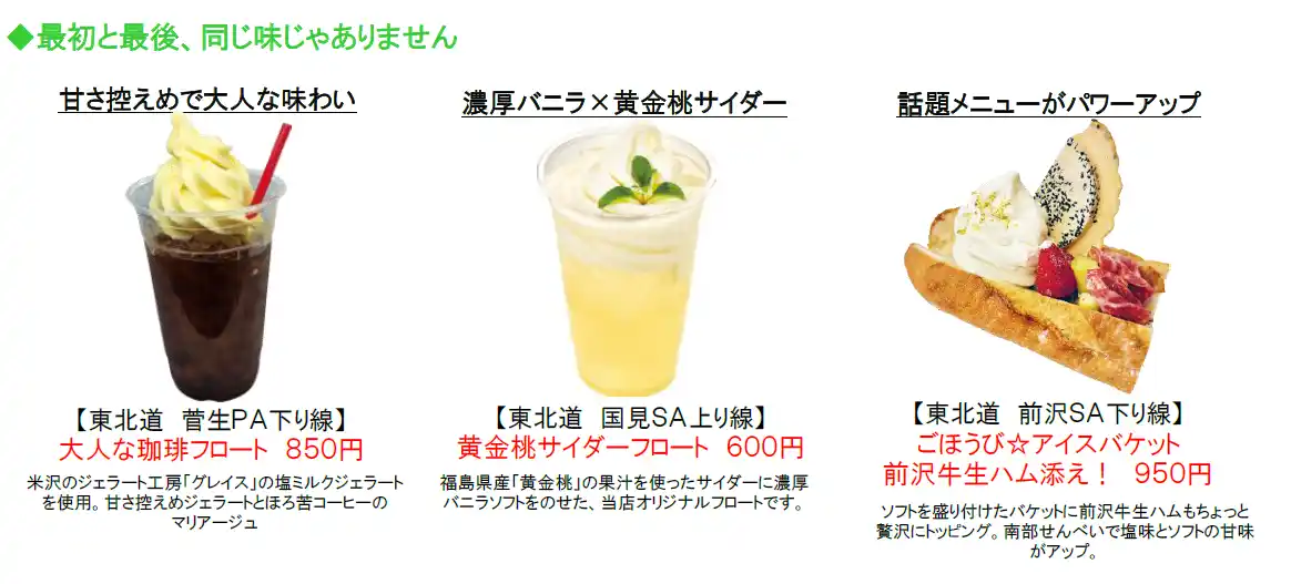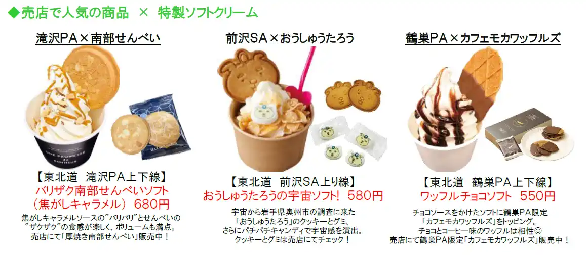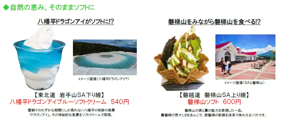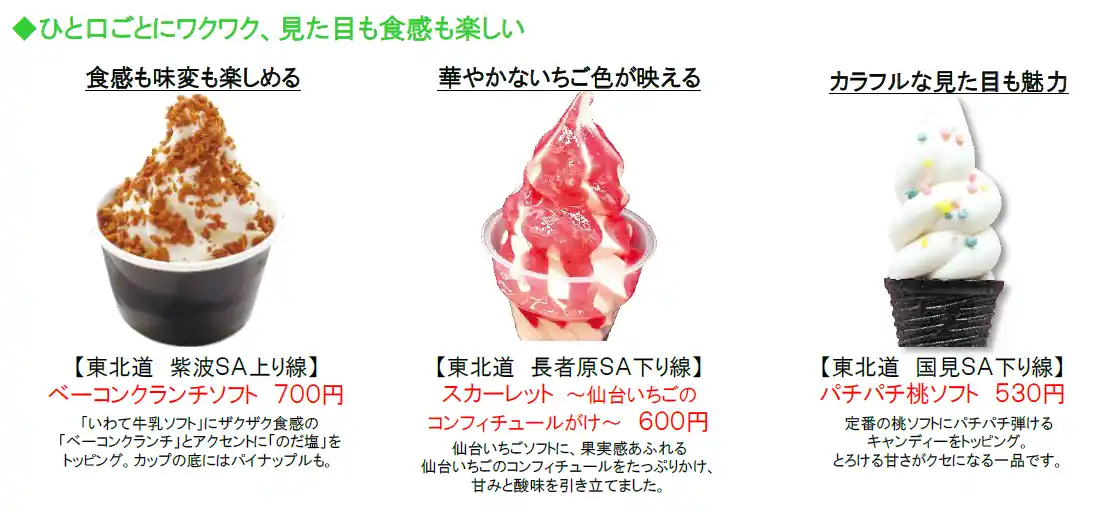 SA・PAを代表する人気グルメである“ソフトクリーム”をテーマにした「ソフトクリームコレクション」(「ソフコレ」)は、毎年多くのお客さまに親しまれています。近年は気温の上昇や行楽シーズンの前倒し傾向を背景に、春先からソフトクリームの需要が高まっていることから、2026年も昨年に引き続きゴールデンウィーク期間からキャンペーンを開始します。「ソフコレ2026」では、新たに開発されたソフトクリームも登場し、東北各地の魅力が詰まったラインアップをお楽しみいただけます。 |