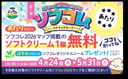 カードを削ってあたりが出たら、ソフコレ掲載のソフトクリームを1個無料でプレゼント! |