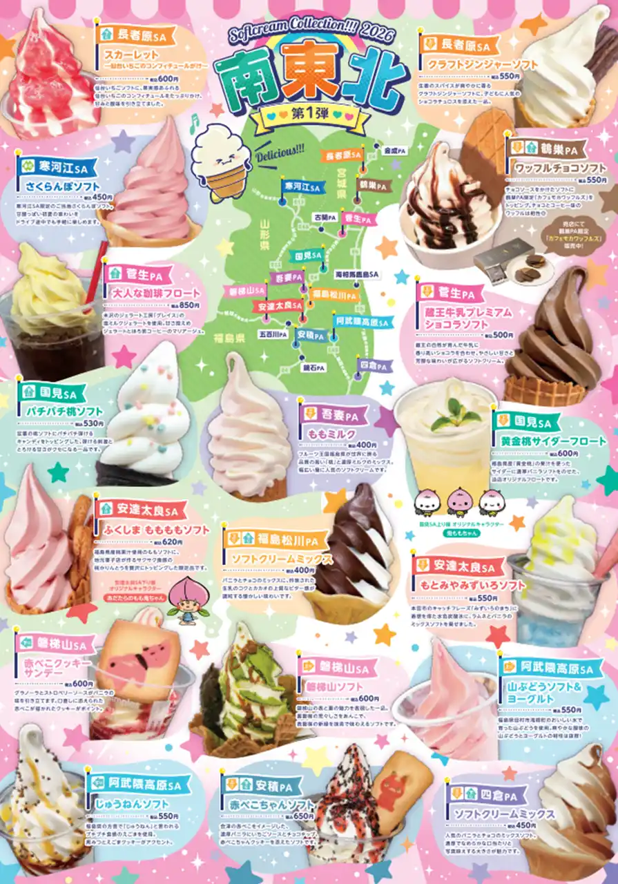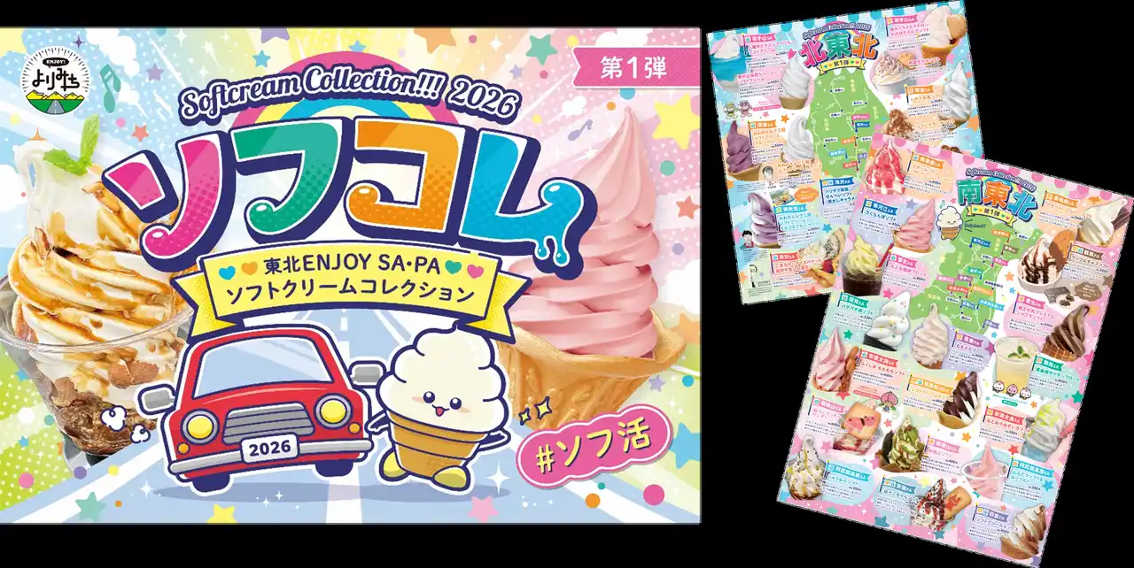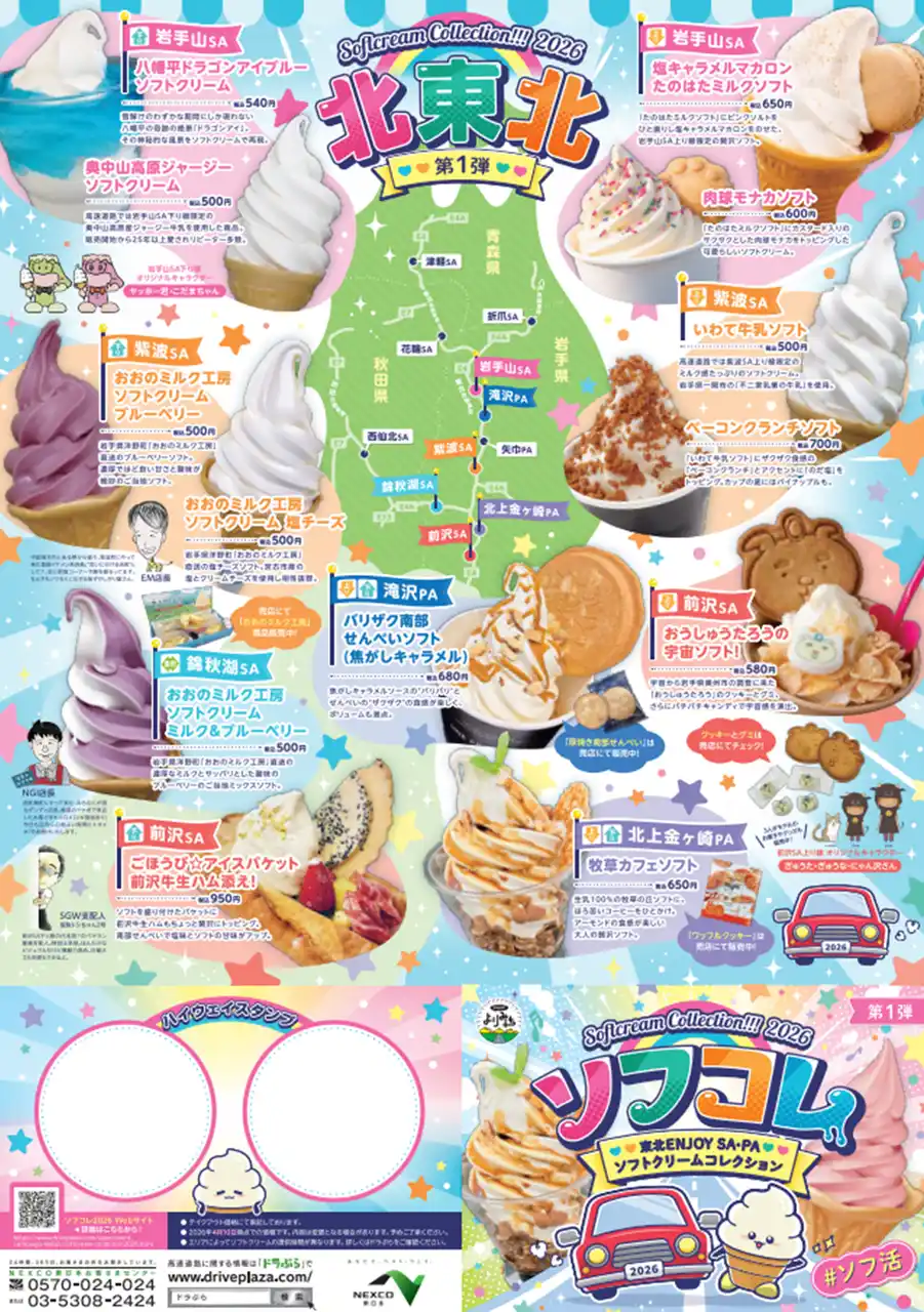 株式会社ネクスコ東日本エリアトラクト(東京都港区)では、東北地方のサービスエリア・パーキングエリア(以下、SA・PA)で販売されている個性豊かなソフトクリームをまとめて掲載したマップ「ソフトクリームコレクション2026」を、4月24日(金)から東北エリアのSA・PAにて配布開始します。 |