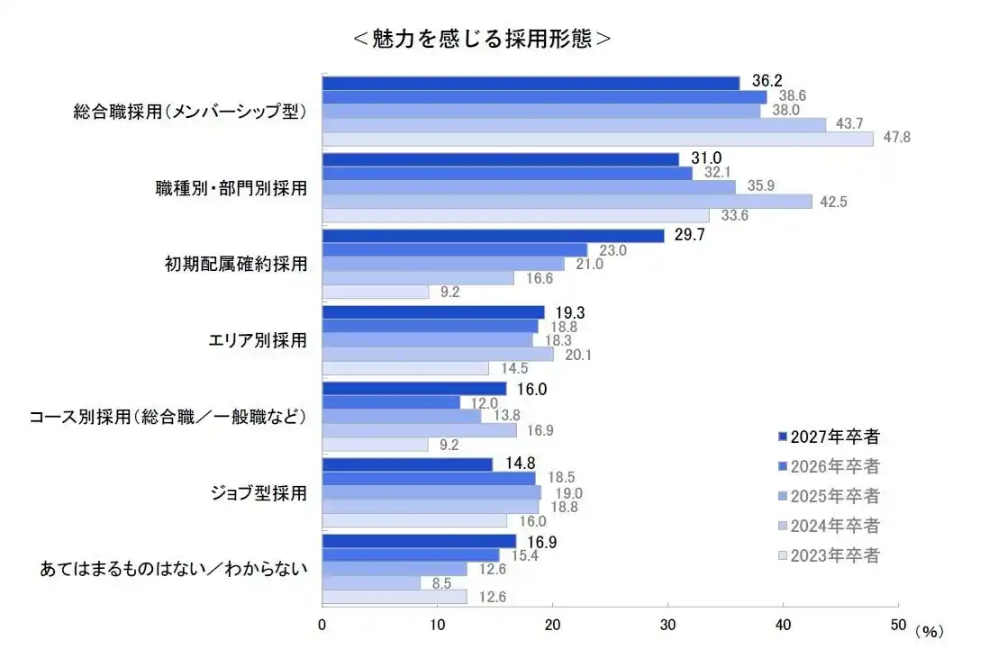 | ○「総合職採用(メンバーシップ型)」が最多も、減少傾向。「初期配属確約採用」は年々増加 | |||