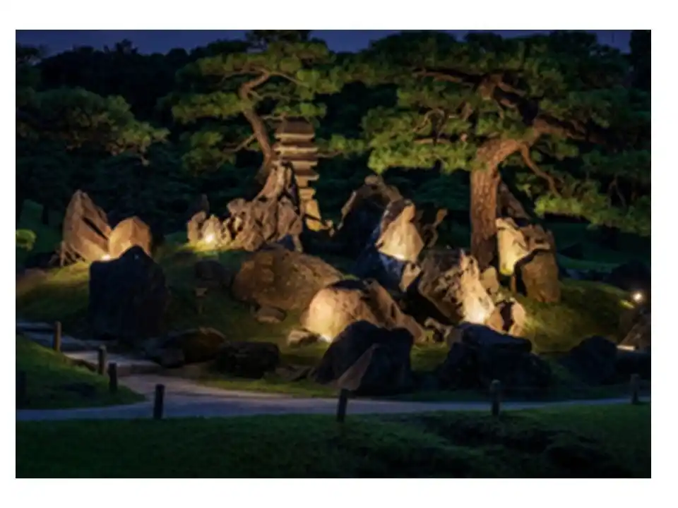 旧芝離宮恩賜庭園は、江戸初期に造られた大名庭園の一つで、回遊式の泉水庭園です。かつて海であった場所を埋め立てて造られ、往時は海から大泉水(池)に海水を取り入れ潮の満ち引きとともに景色が移ろいました。石、山、池、木々のひとつひとつに、深い意思と歴史が宿り、それは今も静かに息づいています。今回は、庭園全体のライトアップにとどまらず、景石、築山、池、浜、島などにスポットライトを当て、大泉水や勇壮な石組に、海面や往時の潮の満ち引きを彷彿とさせる幻想的な風景を演出します。 |