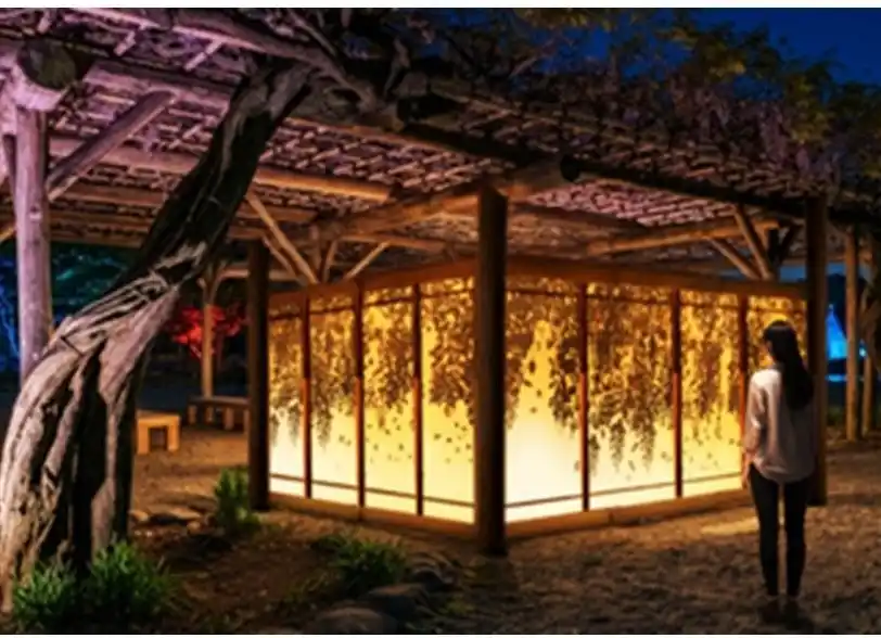 光に浮かび上がる藤の花を通して、庭園に息づく記憶を演出し、都市の喧騒から静かな庭園の世界へ誘います。 |