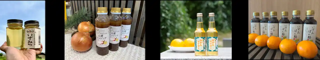 画像左より、和泉市産百花はちみつ「いずみつ」、山愛ドレッシング、大阪みかんサイダー、 いずみぽん酢 ※画像はイメージです ※なくなり次第終了 |