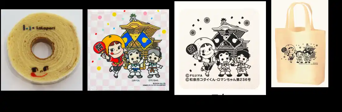 リニューアルを記念して、この春ららぽーと和泉にオープンする不二家とコラボを実施。不二家の人気キャラクター「ペコちゃん」と一緒に、和泉市イメージキャラクターのコダイくんとロマンちゃん、和泉みかん、だんじりなど和泉にゆかりのあるものが描かれた「ららぽーと和泉×ペコちゃん オリジナルノベルティ」を開発しました。三井ショッピングパークアプリの画面提示で、ららぽーと和泉×ペコちゃん オリジナルデザインのバウムクーヘン・ミニタオル・コースター・トートバッグいずれか1つをプレゼントします。 |