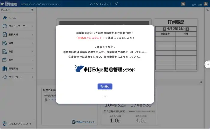勘定奉行をはじめとする奉行クラウドなどの基幹業務システムを開発・販売する株式会社オービックビジネスコンサルタント(代表取締役社長:和田 成史/本社:東京都新宿区/以下OBC)は、クラウド勤怠管理システム・ソフト『奉行Edge 勤怠管理クラウド』において、就業規則に沿った勤怠申請書をAIが自動作成する業界初の「申請AIアシスタント」を2026年4月16日より提供開始いたします。 |