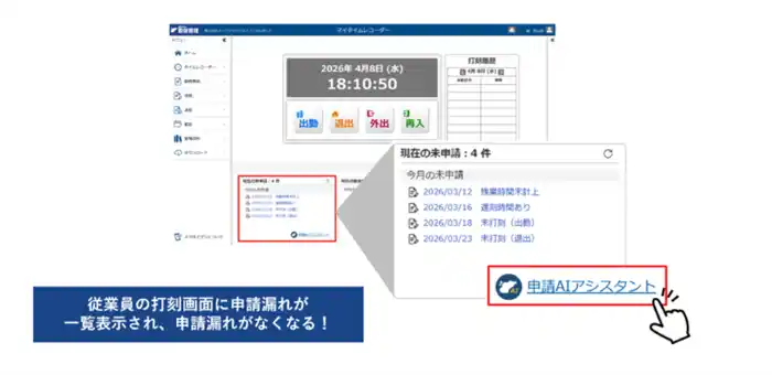 勤怠期間内にある「提出が必要な勤怠申請」をシステムが自動で検知し、従業員のダッシュボードに一覧で表示します。企業によって異なる就業規則も学習するため、従業員はAIアシスタントに沿って申請するだけで、誰でも申請漏れを防ぐことができます。 |
