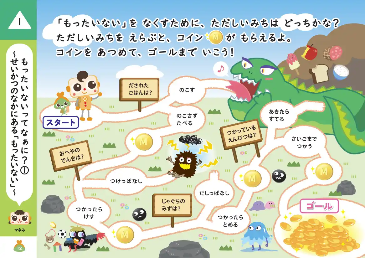 本ワークブックは「キッズ・マネー・スクール」のイベントで体感するお金についての本質的な学びを、家庭で継続して深め、意識を定着させることを目的としています。単なるお金の計算問題ではなく、クイズや迷路などのあそびを通して、「お金の役割や大切さ」「モノを大切にすること=お金を大切にすること」などを学びます。 |