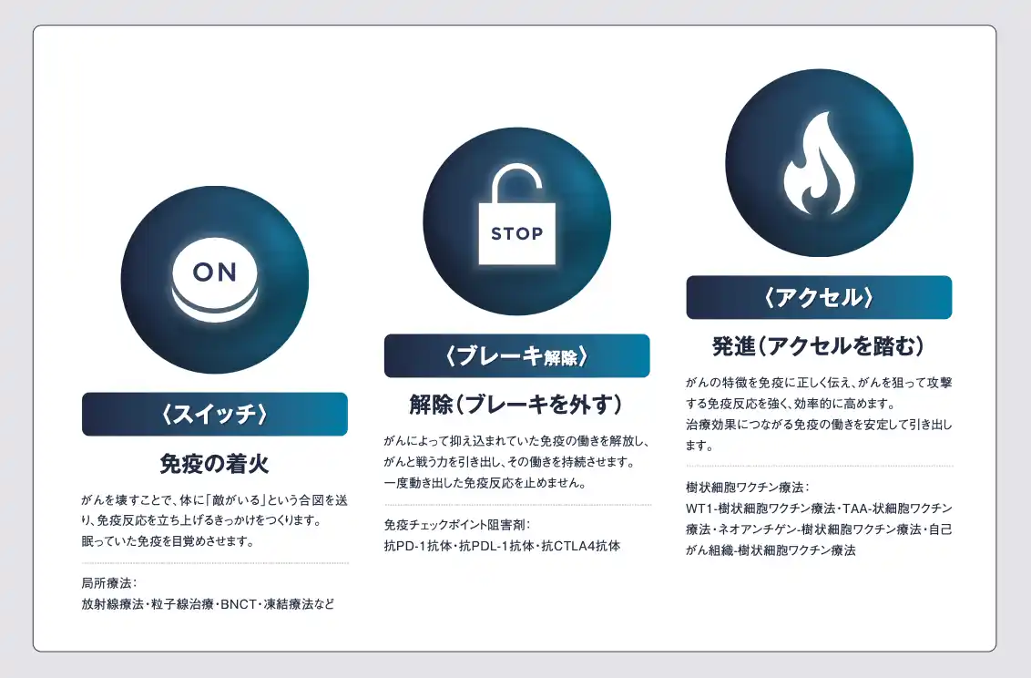 SynerTri Immunotherapy(R)は、免疫の立ち上げに重要なポイントである「スイッチ」「ブレーキ解除」「アクセル」という3つの働きに着目した治療戦略です。 |