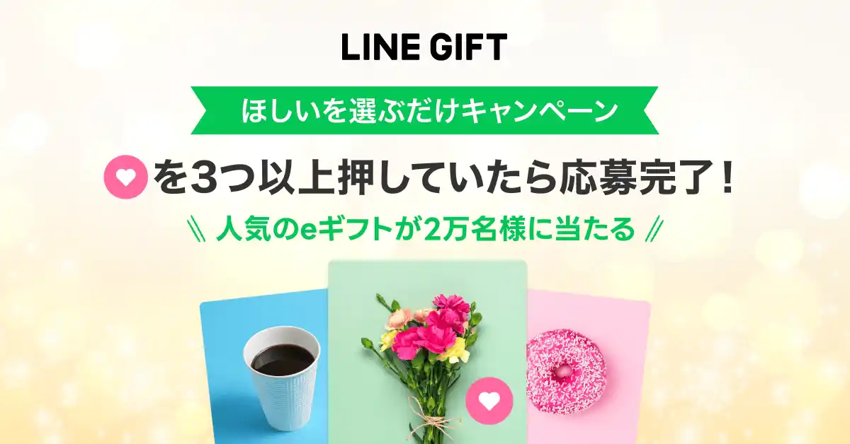 本キャンペーンでは、期間中にほしいものピックにて3つ以上の商品に「ほしい((ハート))」をつけることでエントリーとなります。エントリーした方の中から抽選で合計2万名様に、「LINEギフト」で人気のeギフトが当たります。 |